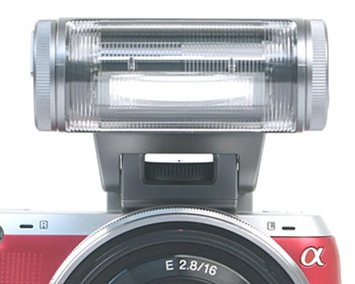 The optional HVL-F20S has a GN20 power rating and sports an adjustable head. Like the bundled HVL-F7S, it screws onto the accessory terminal. It draws power directly from the camera, so no battery is needed.