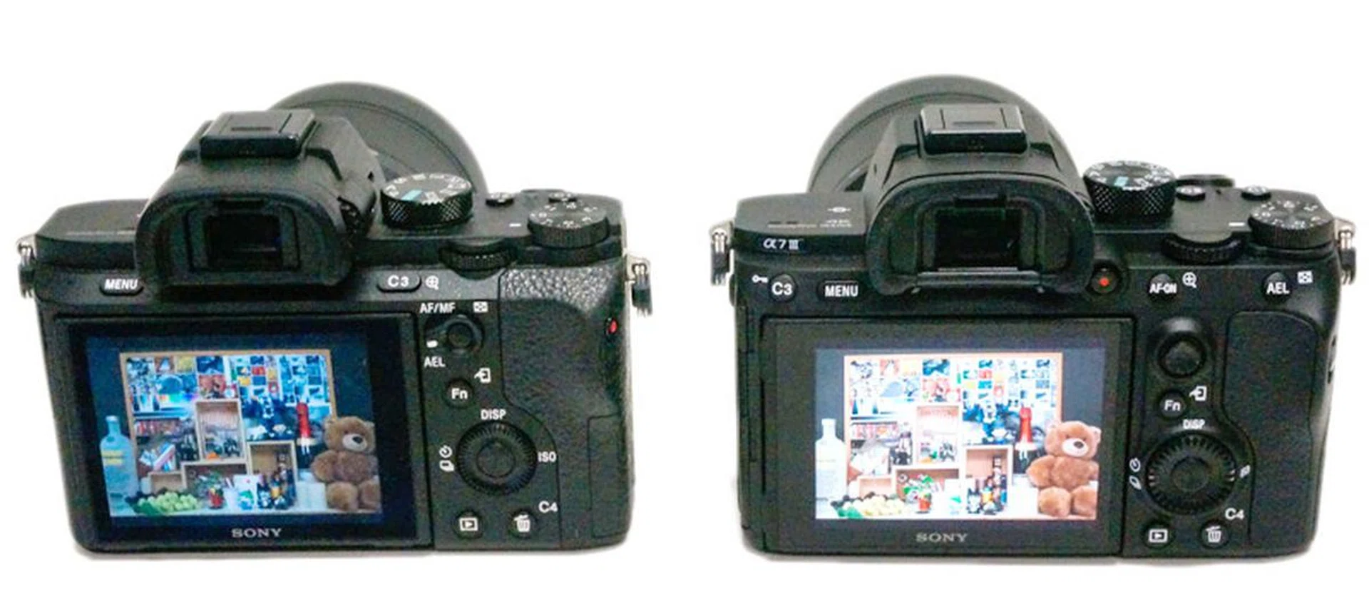 As you can see from the image above, both cameras largely share the same design, just that the newer A7 III appears a little stockier, with a more pronounced viewfinder. There seems to be just a bit more grip space with the newer model, which could largely be explained by the fact that the A7 III uses the larger NP-FZ100 battery (first seen in the A9) for better battery life.
