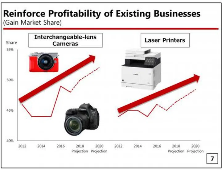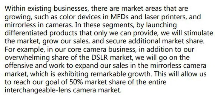 They’re also moving more strongly into the sectors of Healthcare, Commercial Printing, Network cameras, and Industrial Equipment, all of which leverage their strong manufacturing capabilities. Perhaps most of interest to camera lovers is the note we’ve screen captured below, wherein Chairman and CEO of Canon, Fujio Mitarai states that clearly that “we will go on the offensive and work to expand our sales in the mirrorless camera market”.