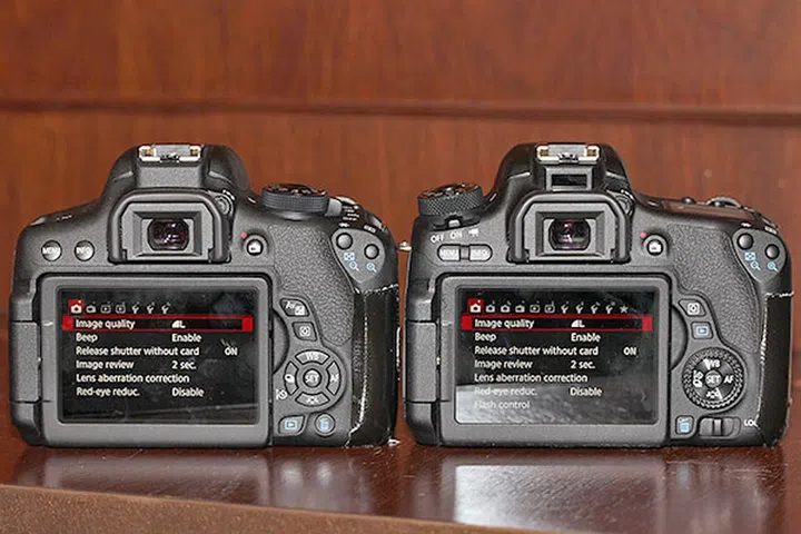 The key differences between the two are more evident when you put them next to each other. Styling-wise, the 750D is closer to the 700D, with the mode dial situated at the top right. On the other hand, the 760D’s mode dial and power switch are moved to the left, to make way for a top status LCD. Both cameras also see more buttons - focus area expansion, ISO, Disp. (or light toggle for 760D’s top LCD panel) - behind the control dial. And instead of individual buttons, the 760D has a rear dial to make menu navigation easier.
