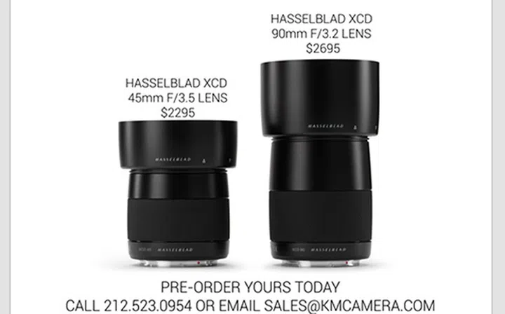 You can see from the pictures that the camera will come with a built-in viewfinder, and the image on the rear LCD suggests the menu system will be similar to what is found on the H6D. The front view shows a huge medium format sensor and a fairly thin body, as well as the price tag – US$8995. MirrorlessRumors also has images of the first two lens for the system – the Hasselblad XCD 45mm f/3.5 lens which retails for US$2295, and the Hasselblad XCD 90 mm f/3.2 lens, which will retail for US$2295.