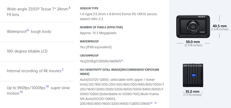 As you can see, it now improves upon the original with a new adjustable flip screen LCD that you can use for selfies, and is obviously still waterproof, shockproof and crush-proof. According to the website, the RX0 II is also IP6X dustproof, and it now features a 15.3MP stacked CMOS sensor paired with the latest version of their BIONZ X image processing engine. 4K movies can also be recorded at up to 4K30p resolution internally with no pixel binning.