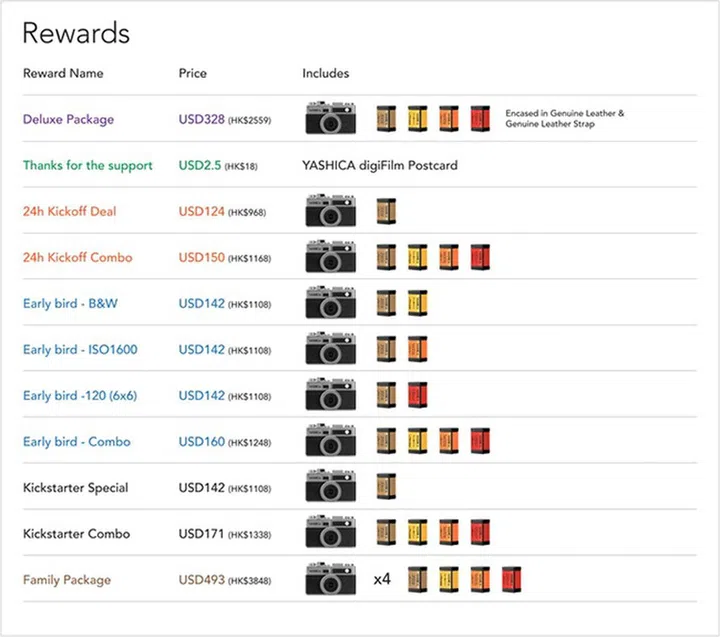 The various reward tiers for pledges on Kickstarter are in the image below: