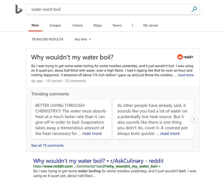 Bing is also teaming up with Reddit so you can now directly get information in Reddit threads coming up as results to your search queries. So if you search something like "Why won't my water boil," and a good answer appears in Reddit conversations, Bing will also surface parts of those conversations at the top of the search page.