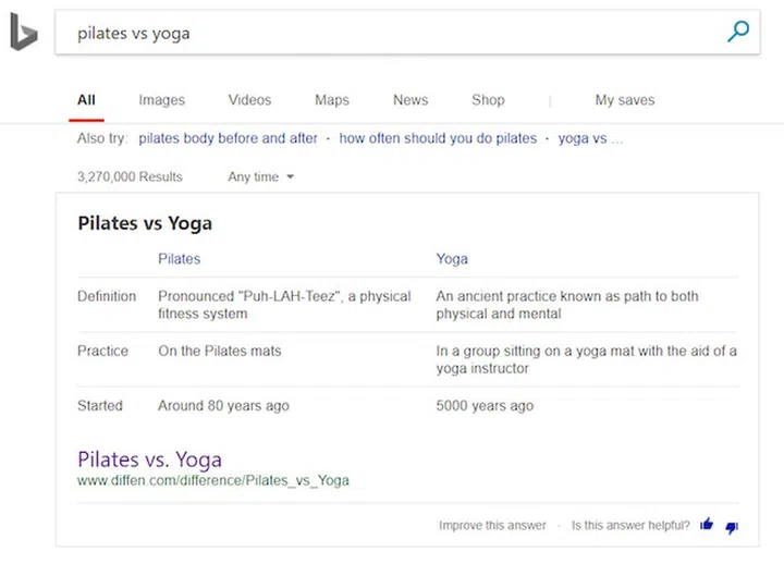 Bing is also looking to offer up multiple viewpoints for certain queries by using machine learning powered insights on search interpretations. So if you ask Google whether an Yoga or Pilates is better for example, they may tell you what Pilates is good for and where Yoga might be more beneficial.