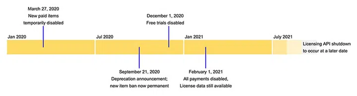 What's new is the disabling of paid in-app items as well, since the publishing of paid extensions was restricted as early as March 2020. Come February 2021, Google will fully shut down its Chrome Web Store payments system, so developers with legitimate paid extensions still have time to migrate their payments platform accordingly. The timeline published by Google below illustrates their plans.