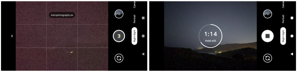 On the Pixel 4, this means combining 15 frames, each lasting for 16 seconds, for a four-minute total exposure time.