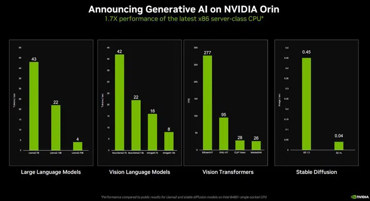 Not only that, NVIDIA claims GenAI processing to be up to 1.7x faster on a Jetson AGX Orin 64GB as compared to an Intel Sapphire Rapids Xeon Platinum 8084+ CPU.