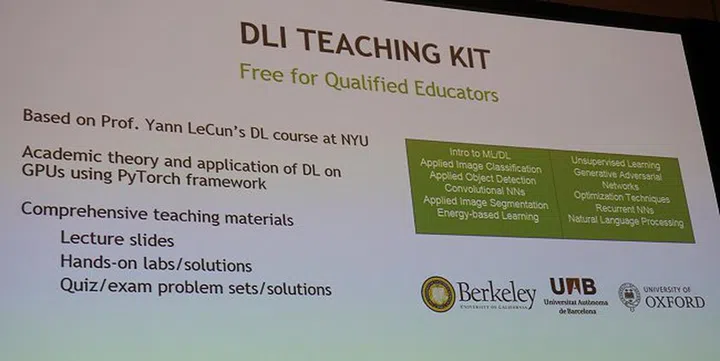 New Courseware for Educators: NVIDIA has partnered with Yann LeCun, director of AI research at Facebook and computer science professor at New York University, to develop the DLI Teaching Kit, which covers the academic theory and application of deep learning on GPUs using the PyTorch framework. Hundreds of educators are already using the DLI Teaching Kit, including the University of Oxford and the University of California, Berkeley.