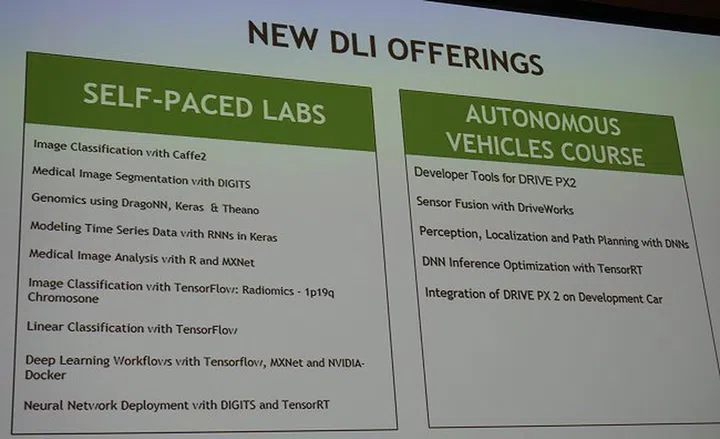 New Deep Learning Training Labs: NVIDIA is working with Amazon Web Services, Facebook, Google, the Mayo Clinic, Stanford University, as well as the communities supporting major deep learning frameworks to co-develop training labs using Caffe2, MXNet and TensorFlow.