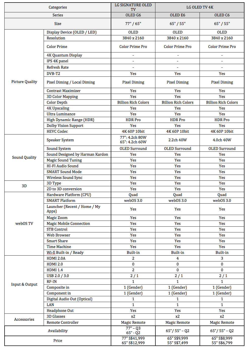 The 55 and 65-inch E6 and C6, and the 65-inch Signature G6 are set to hit stores in Q2 this year, whereas the 77-inch G6 will arrive later in Q3 (likely in limited quantity, too). Here’s the spec sheet of these OLED TVs, including pricing, courtesy of LG Electronics:
