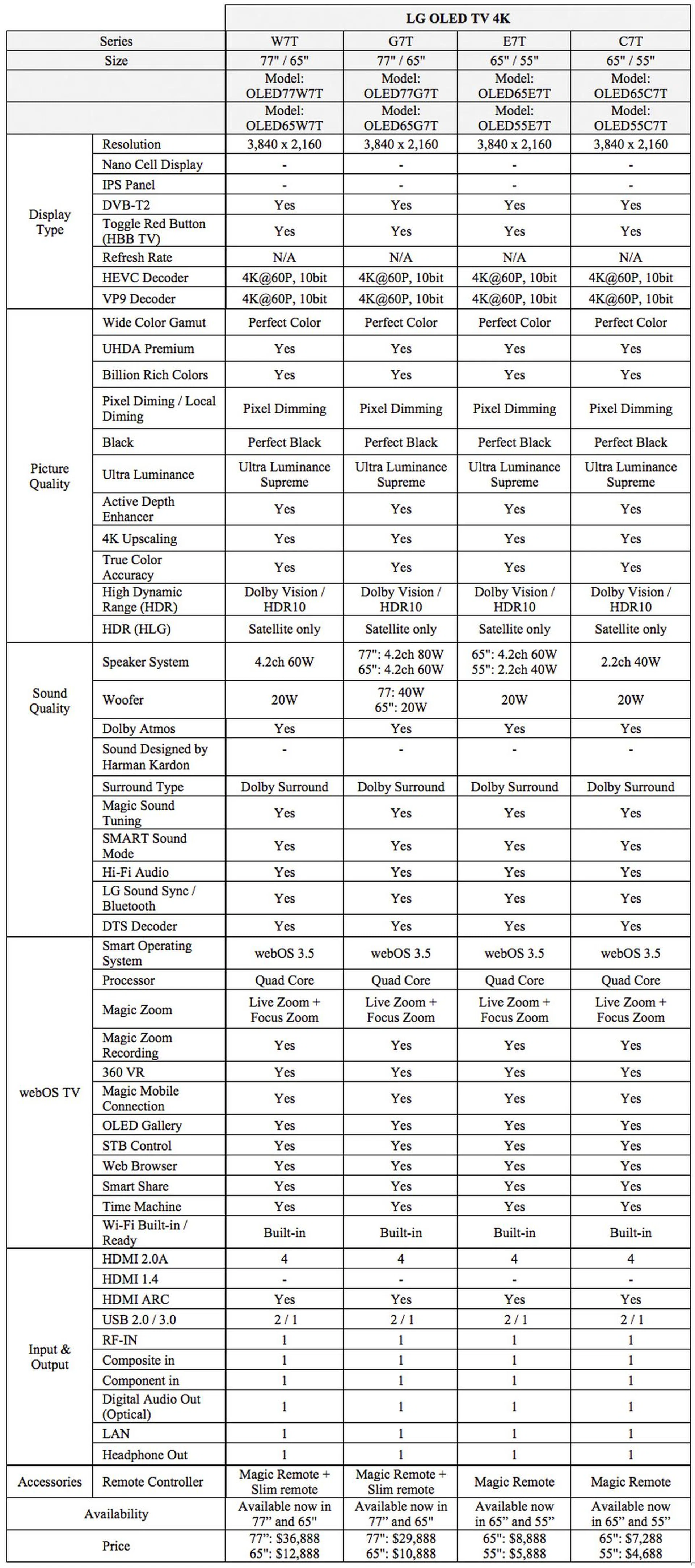 To conclude, here's a table summarizing the new OLED TVs' key specs, along with pricing/availability details, courtesy of LG Electronics: