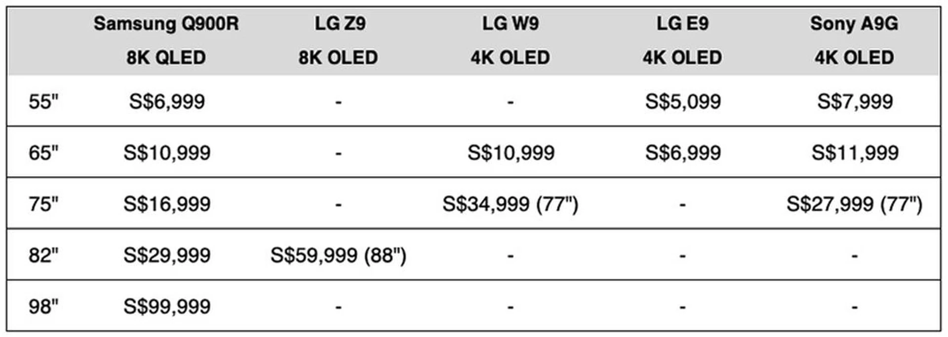 Last but not least: price. The LG E9 only comes in 55- and 65-inch screen sizes, priced at S$5,099 and S$6,999 respectively. For Sony, the A9G is available in 55-, 65- and 77-inch sizes, priced at S$7,999, S$11,999 and S$27,999 respectively. Looking at the table below, purely from a pricing standpoint, the LG E9 offers the best bang for the buck if you just want a high-end 4K TV no bigger than 65 inches. (The W9 is, for the most part, a more premium E9 with a wall-mount-only design and a separate soundbar.) For the 75-inch and above class however, the Samsung Q900R 8K QLED is the runaway value leader.