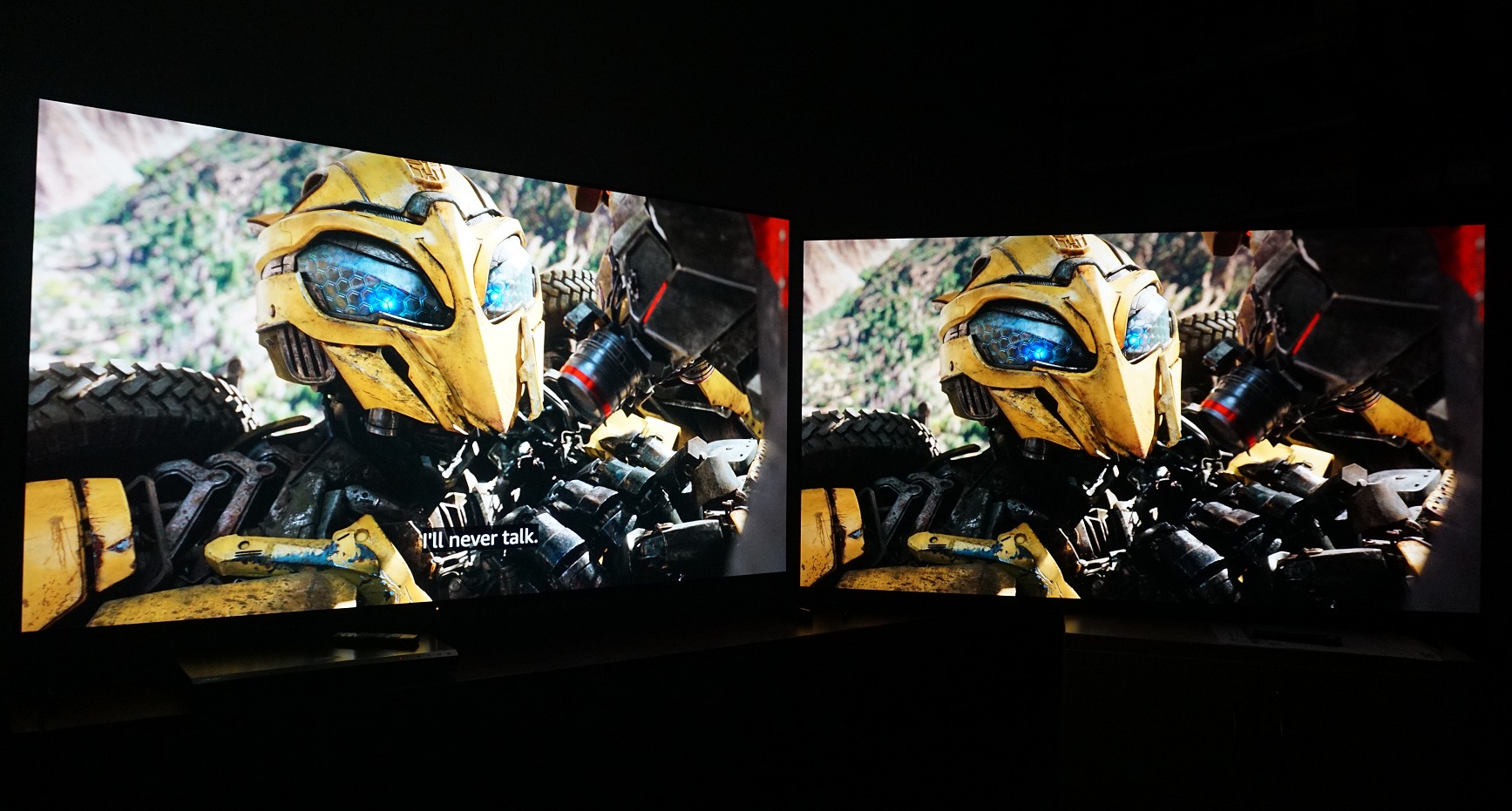 Left: Sony A90J Master OLED (2021) vs Right: Sony A80K OLED (2022). Granted the 2021 model was a 'master' tier, in-so-far as large screen TVs are concerned, the A80K was Sony's lead 2022 model and the first to feature anti-glare coating. The result was the newer TV was less vibrant and some details were harder to discern, whereas the older TV had more convincing HDR delivery worthy of your OLED purchase. Onscreen show: Bumblebee movie streamed from Amazon Prime. (Click to view a larger image.)