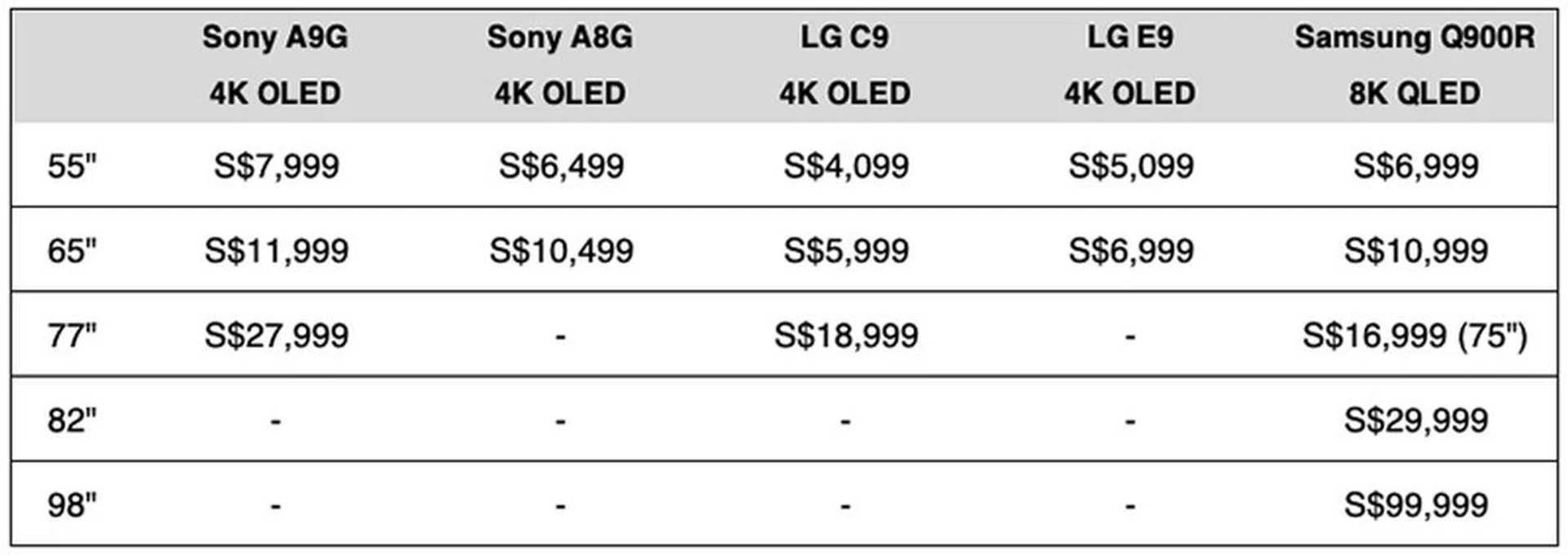 - 77-inch — A9G: S$27,999 | A8G: NA