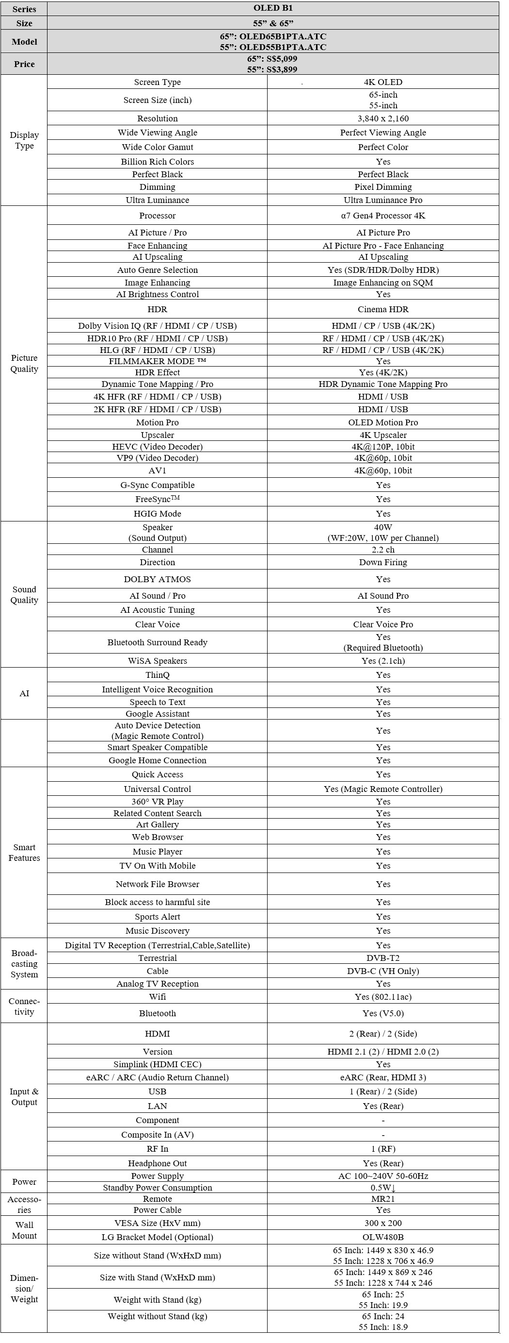 Dolby Vision IQ Dolby Atmos HDR10 PRO Filmmaker Mode HDMI 2.1 webOS 6.0 Game Optimiser | 55-inch | S$3,899 | |