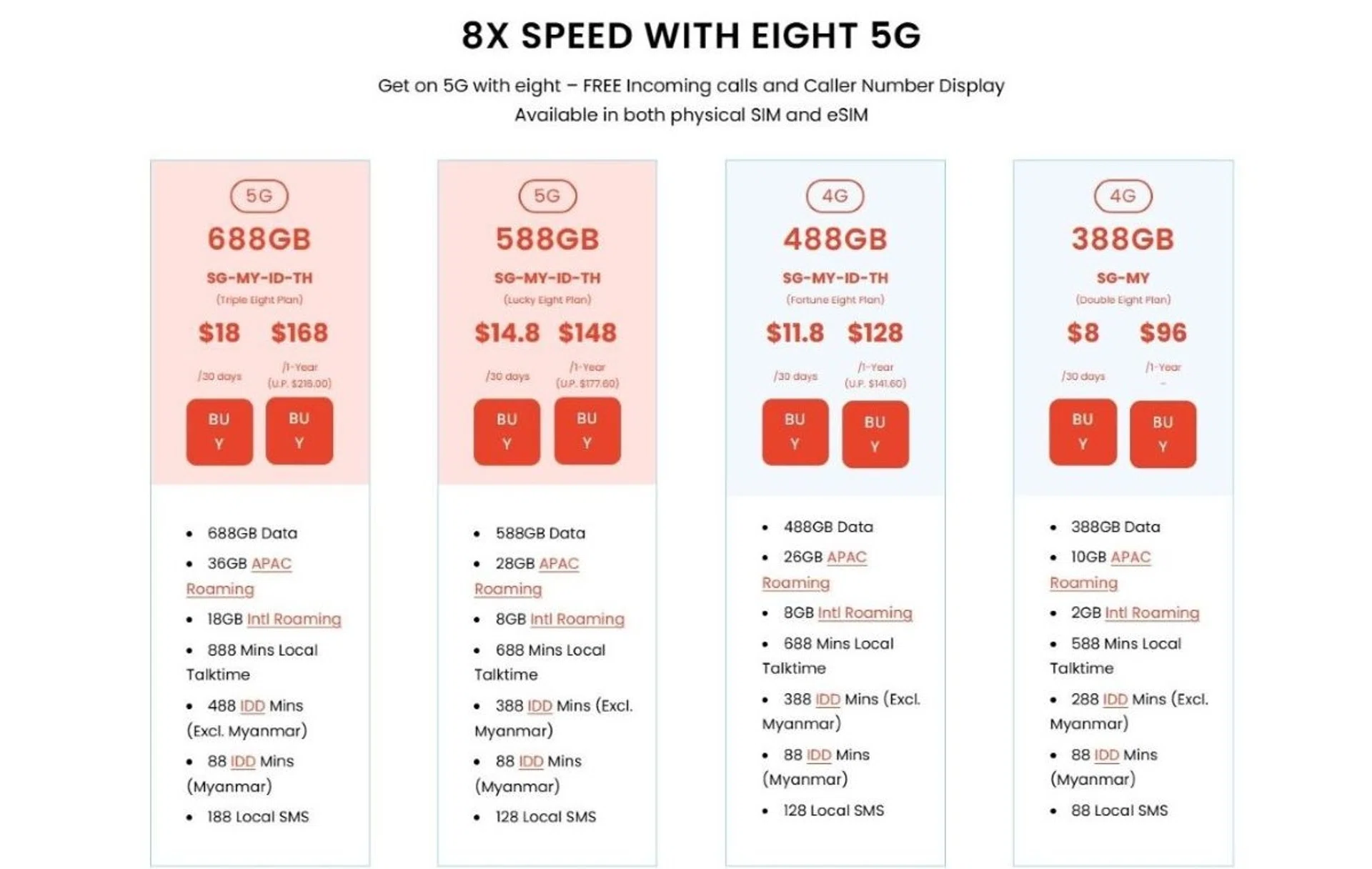 Eight’s new 5G plans have arrived to take customers on a journey to 5G on its standalone 5G core that is leased from StarHub. The plans are a new Lucky Eight Plan and the Triple Eight Plan.