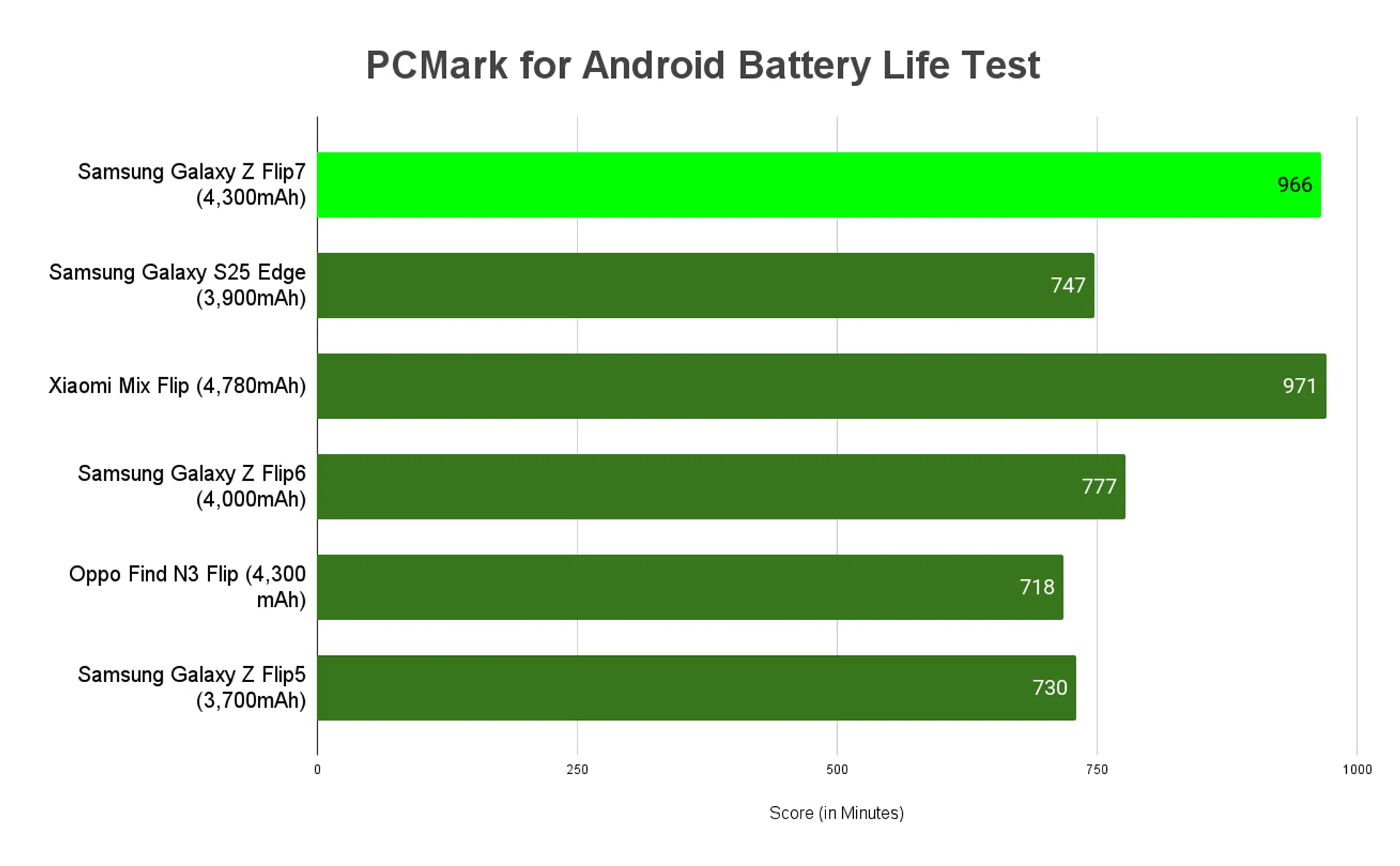 Disclaimer: A known bug affects the Galaxy Z Flip7 and Galaxy Z Fold7 running on One UI 8. The bug prevents PCMark’s battery benchmark from proceeding normally until the displays are touched, constantly and repeatedly. The benchmark developers (UL Benchmark) and Samsung are aware of this bug and are working on a solution. To complete this test, we used a macro script to “touch” the devices’ screens, which may mildly impact battery life. We will revisit this test when this bug is fixed.