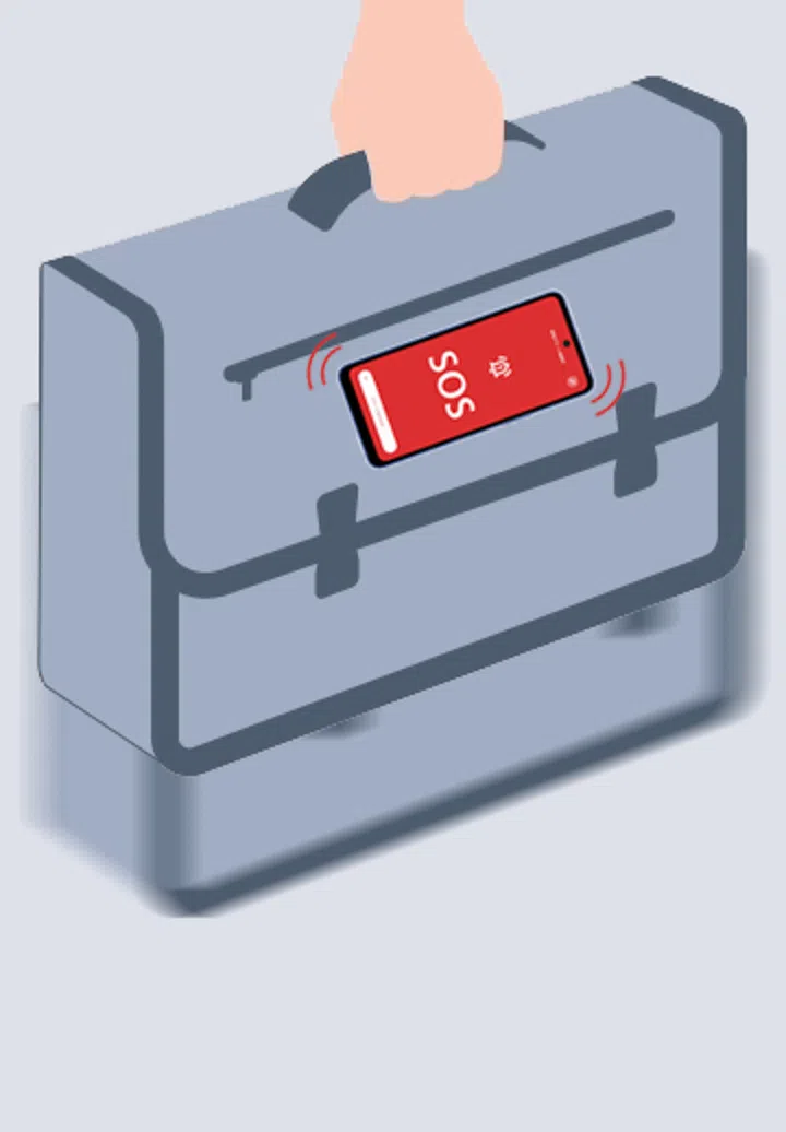 Sharp AQUOS wish5 illustration of in-bag shaking to activate SOS alarm.