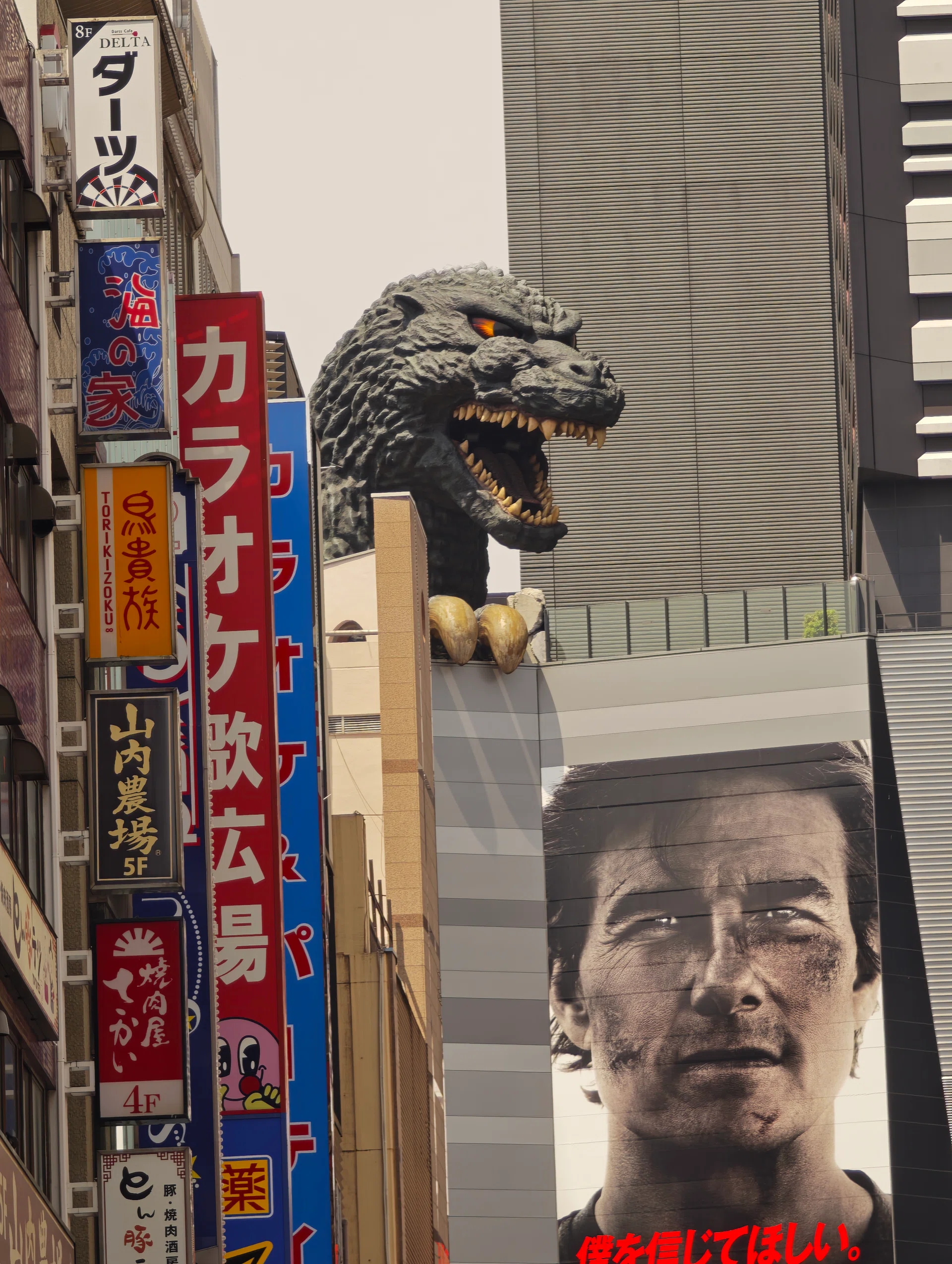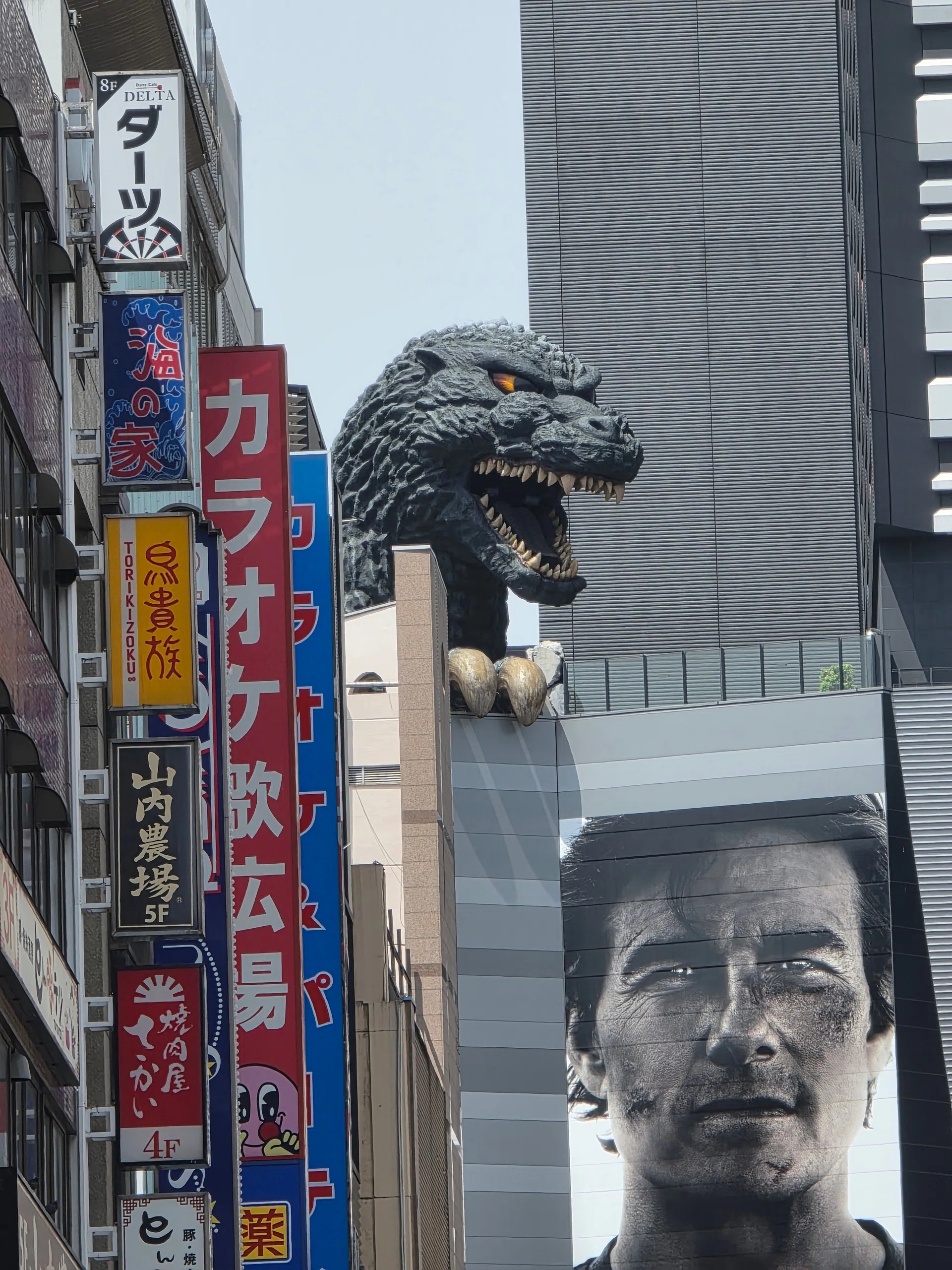 The photo from the Samsung Galaxy S25 Ultra is good. While the colour temperature leans towards its cooler profile, the signage is the most accurate out of the bunch. Overall sharpness is good as well, with great detail on the Godzilla head.
