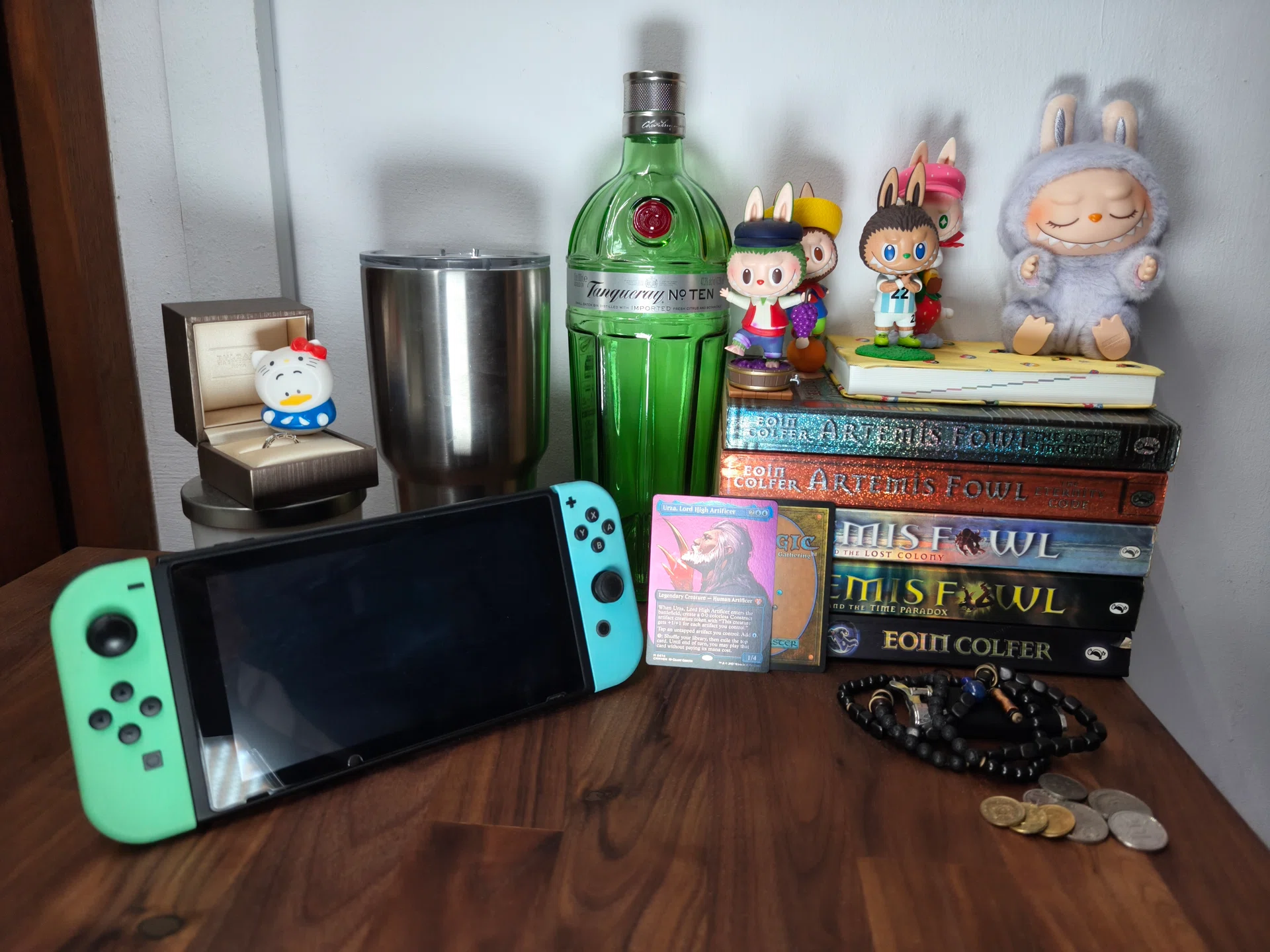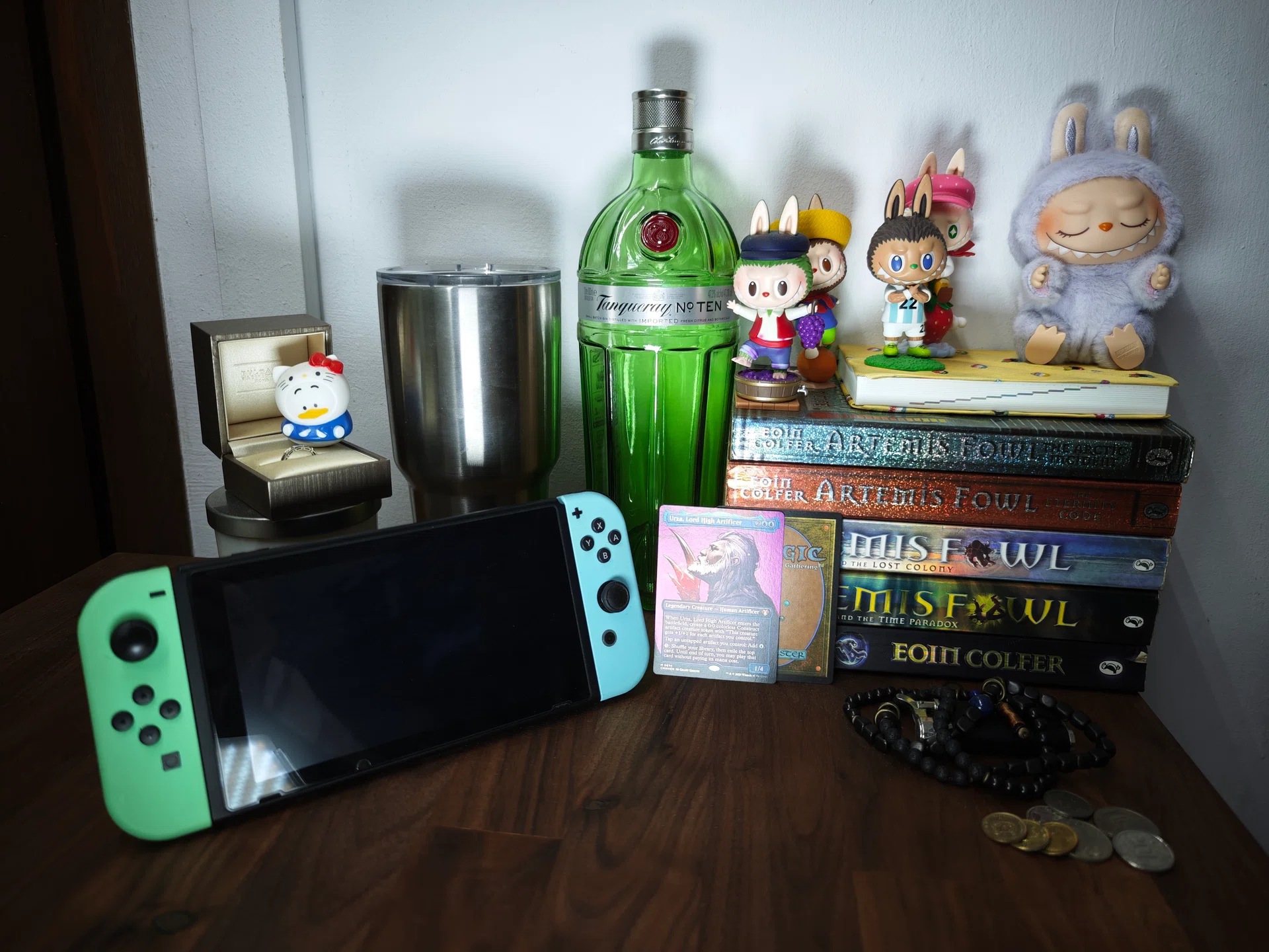 The control photo taken with the OPPO Find X8 Pro shows the same issues from before: sharpness falloff. Aside from that, the label of the glass bottle is sharp and legible, the colours are accurate and the colour and texture of the Magic: The Gathering card looks correct.