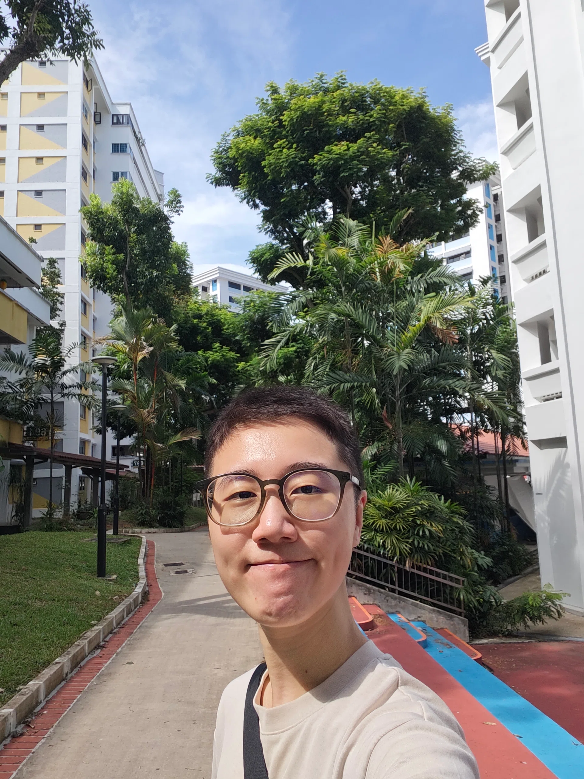 The selfie photo taken with the Galaxy S25 Ultra is the most accurate. From the blue steps to the skin tone, texture and blemishes, everything looks as it should. The photo also retains sharpness and detail in the foliage immediately behind the subject, and this is the only shot that managed to capture the brick texture in the grey and yellow accent wall of the HDB block behind.