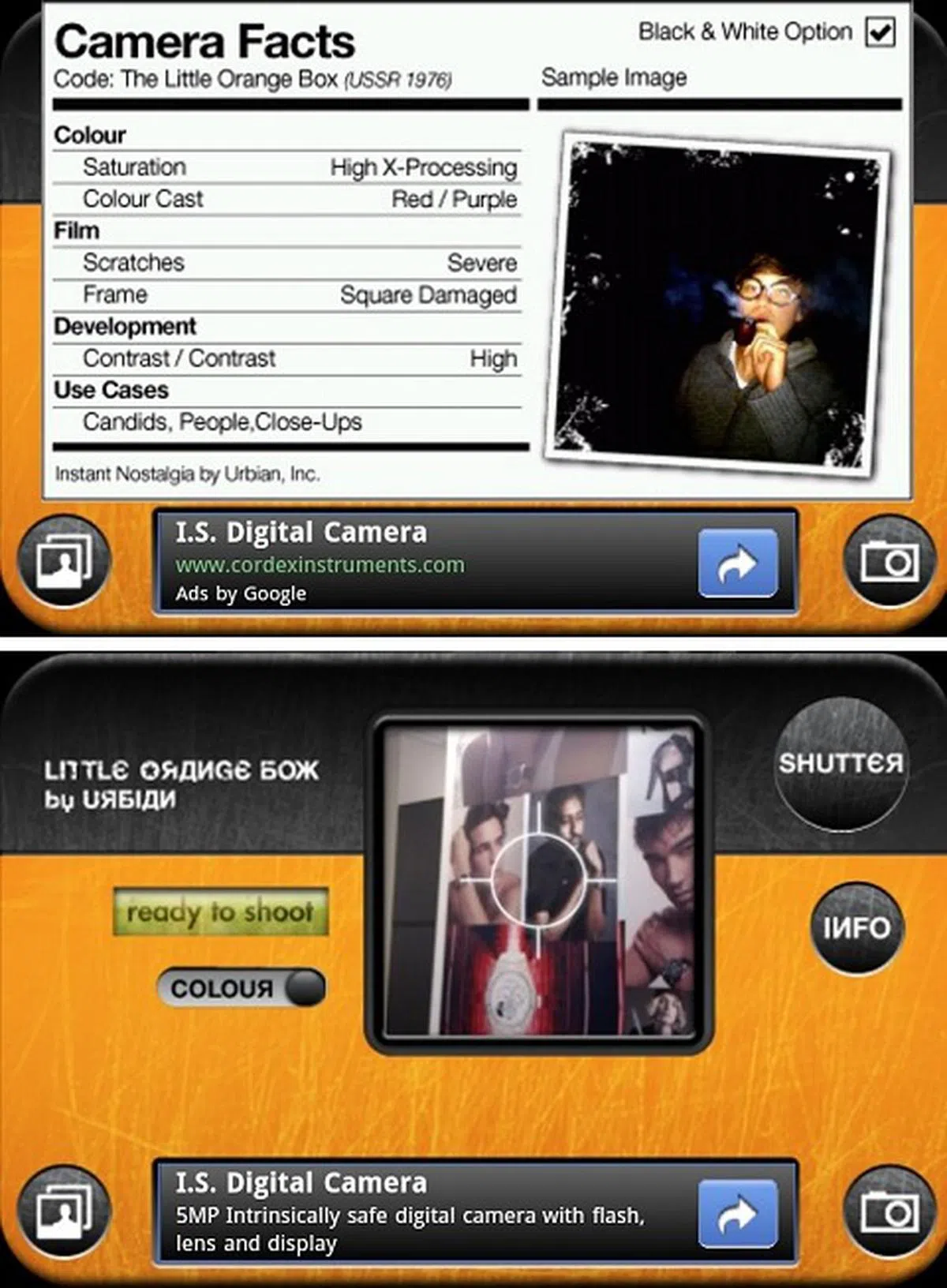 The Vignette app is slightly more complicated to use, but you will soon find that the trouble is well worth the while since it has 68 effects and 56 frames, out of which includes cross-processing, double exposure and tilt-shift.The real juice is where the effects and frames are at. You can personalize your photo through selecting specific settings or you can settle for a preset under the Favorites Tab.The interface is pretty straightforward if you know your basic camera parameters well. The best thing is that you can easily place a shortcut on your home screen that fires up the camera immediately with your favorite settings. If you looking to test the waters first, you can download a free version called Vignette Demo. | |