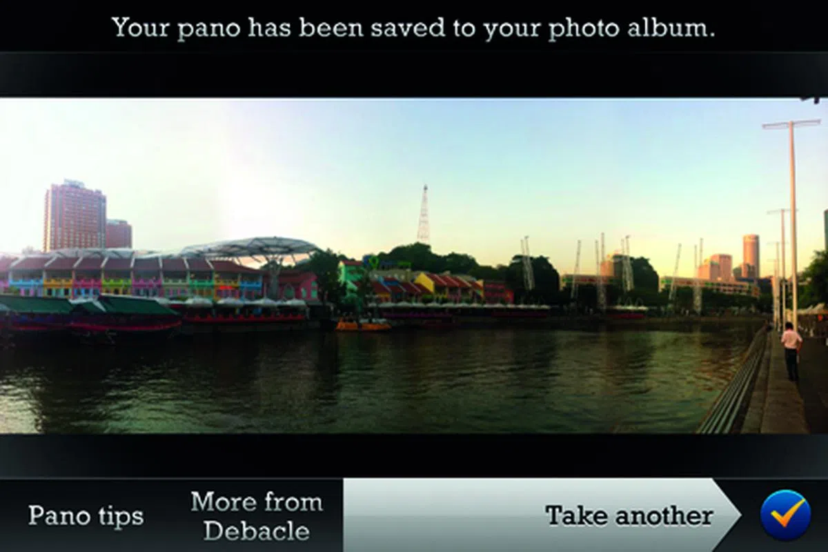 Like 360 Panorama, Pano’s interface is straightforward – just choose your orientation and press Shoot. Unlike 360 Panorama however, Pano doesn’t come with any guides. Instead, after each shot it displays a transparent silver of the edge of the previous photo on the side, and you have to align the present shot with that edge. It can get complicated. Noticing small details on a transparent bar and aligning those details to the real-world on the 3.5” display of the iPhone can be really difficult.
