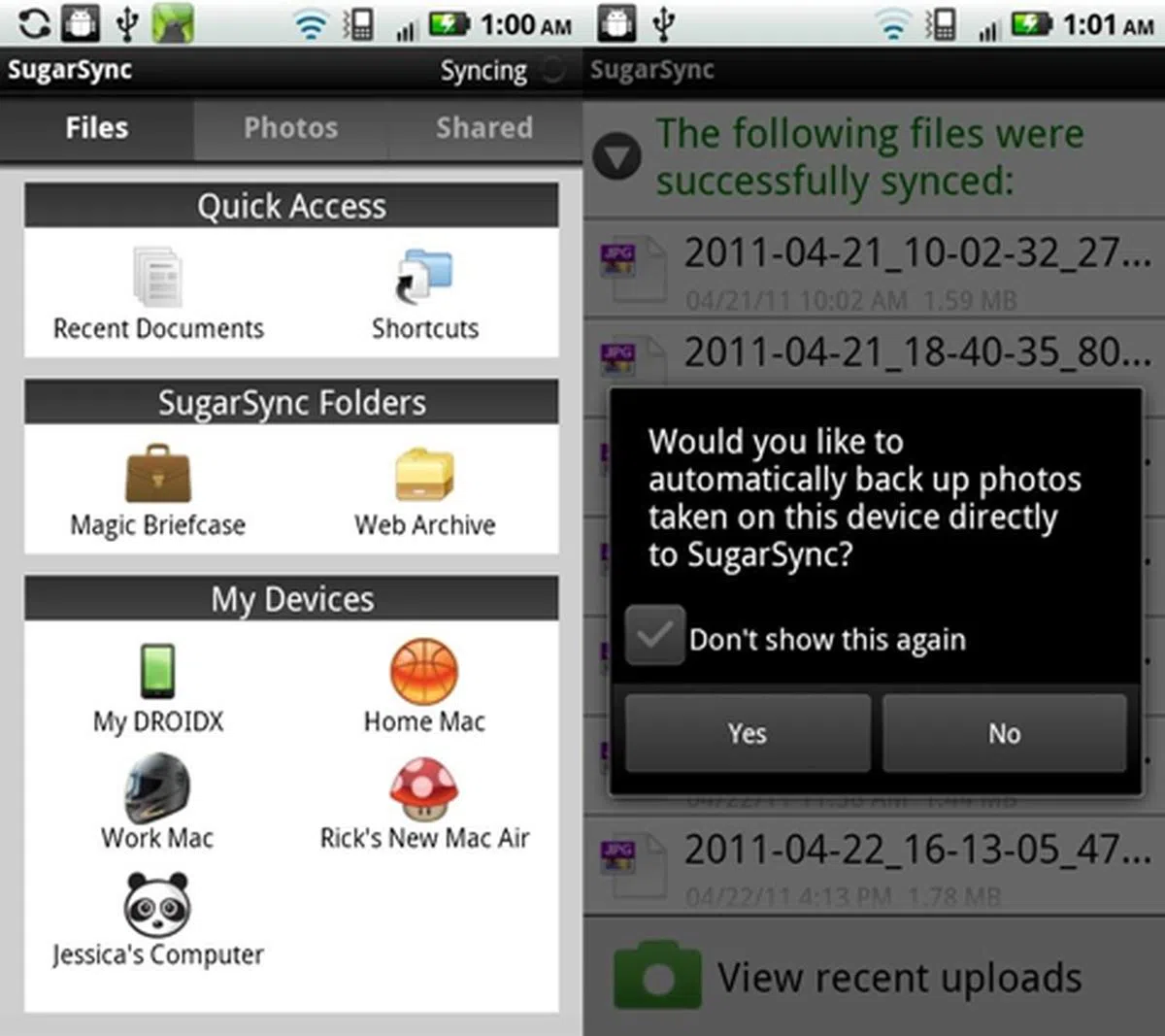 While Dropbox is plagued with the privacy fiasco, you have other alternatives to choose from such as SugarSync. Similar to Dropbox, it offers 5GB free online storage space for backing up your files, sharing them and syncing across different devices. You can enable auto syncing of photos and folders from your Android devices on SugarSync and it backs up any new files to the cloud in the background. Concerns over data security are addressed with SugarSync's use of 128-bit AES encryption standard, which is also used to secure online financial transactions. | |