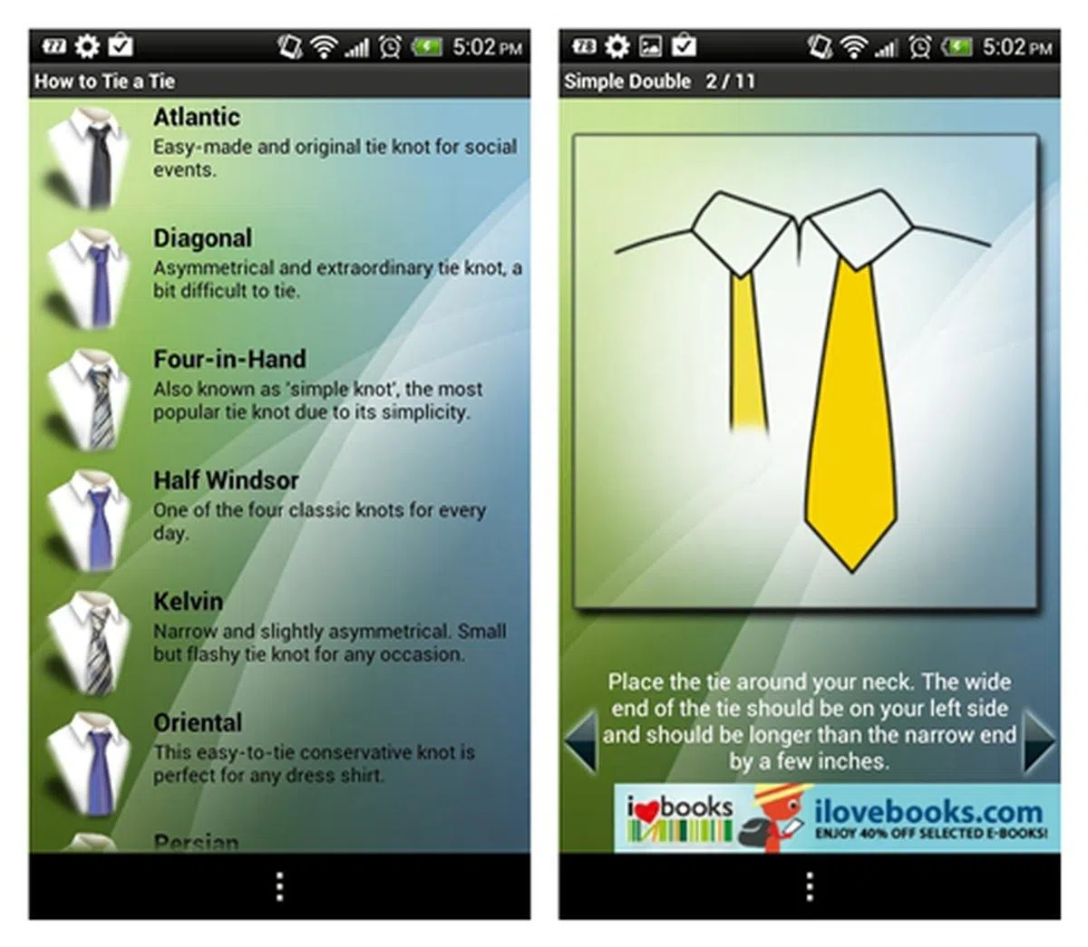 Most of us should have come across similar situations when our dads seek advice or assistance in helping them tie their ties. With How to Tie a Tie app, your dad will now know which type of ties suits what occasion. It will also offer step-by-step instructions on how to tie in 13 different variations. A similarly-named app can also be found for Apple iOS which offers 16 tie variations, three more than the Android version. | |