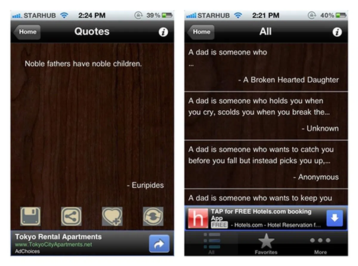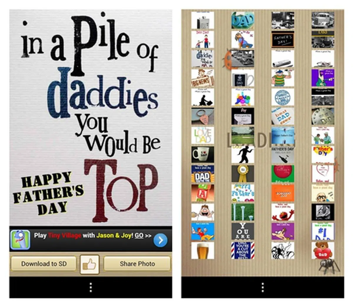 If sending greeting cards isn't your style, you can consider sending some meaningful quotes to surprise your father and bring a smile to his face. Father Quotes app has a collection of quotes ranging from humorous to heartwarming types to suit different personalities. Similar to Greeting Cards for Fathers Day app, you have one-click sharing to all the major social networking sites, email and MMS. | |