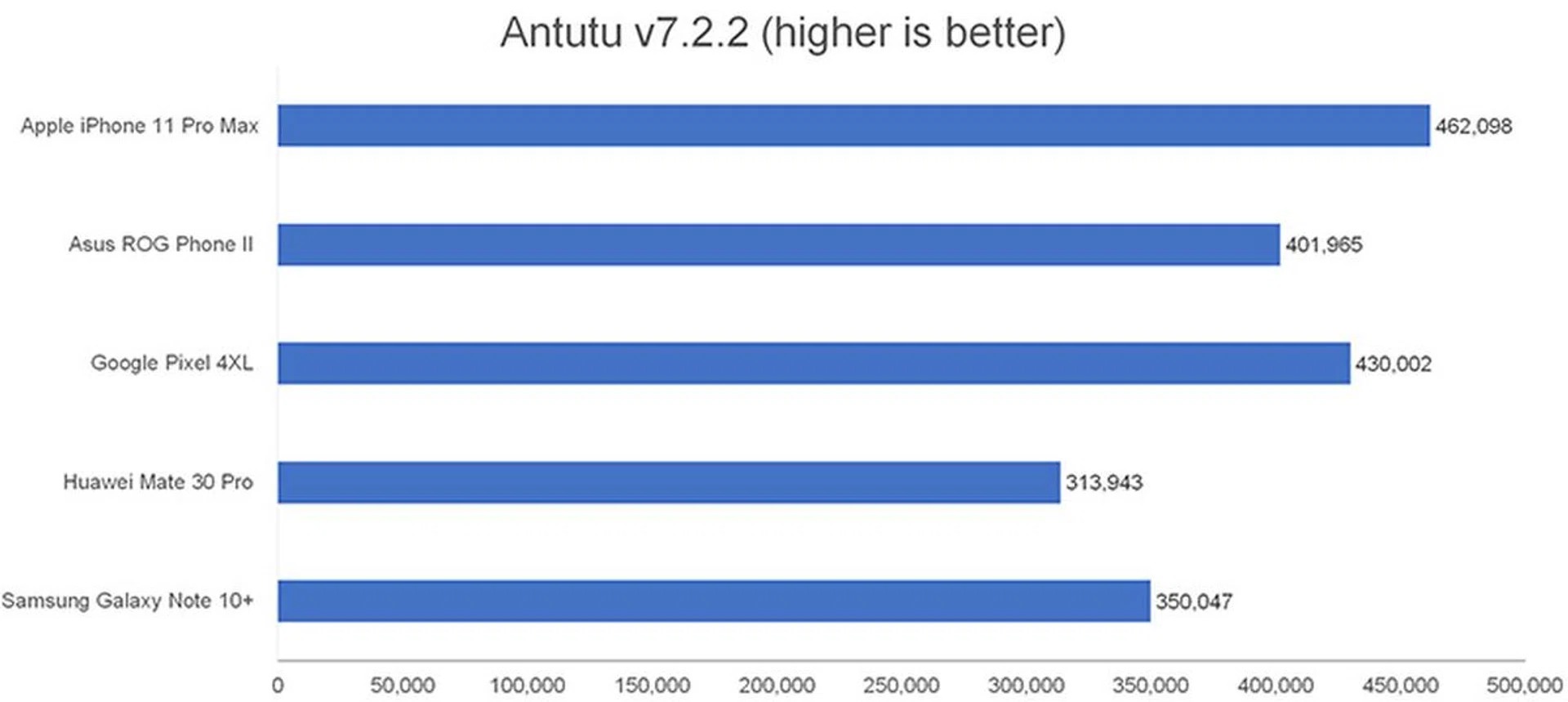 With this, the iPhone 11 Pro Max surges ahead again with a score of 462,098 compared to the 430,002 from the Pixel 4XL. The next fastest is the Asus ROG Phone II, which also uses Qualcomm's Snapdragon 855 processor (the 855 Plus to be precise). Evidently, Qualcomm has caught up and exceeded Samsung's Exynos and HiSilicon's Kirin chips.