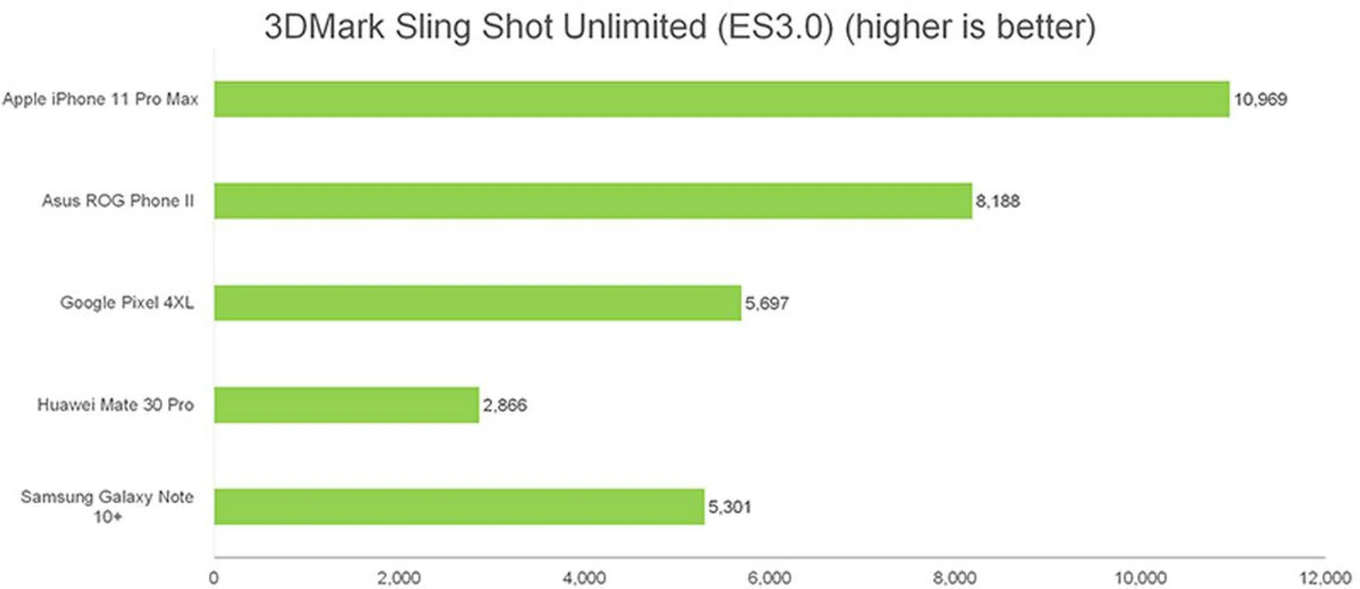 With this gaming benchmark, the Apple iPhone 11 Pro Max pulled clearly ahead of the Android competition, with the next closest competitor being the Asus ROG Phone II with a score of 8,188, some 2,000 points behind the iPhone 11 Pro Max's score of 10,969. Clearly, Apple's GPU is quite a bit ahead of even the newer Snapdragon chips, while the Mate 30 Pro's Kirin 990 obviously has quite a bit of catching up to do.