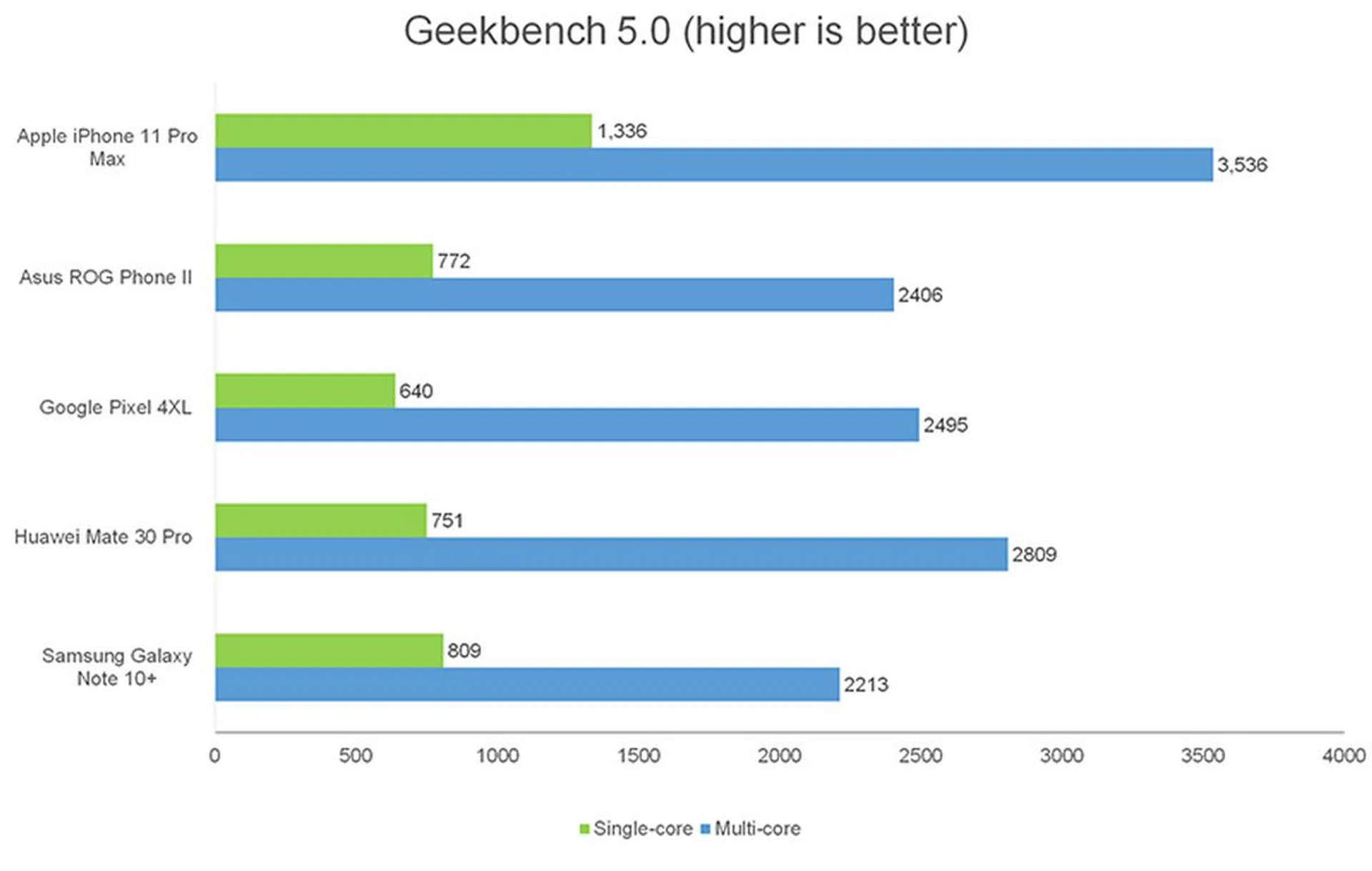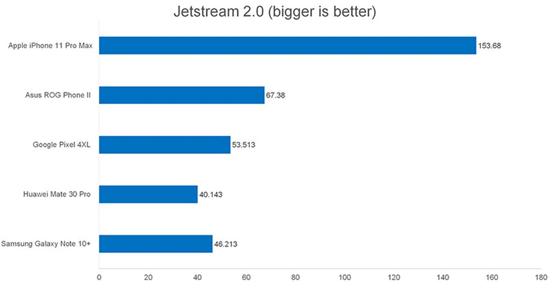 On this benchmark. the iPhone 11 Pro Max's score of 153.68 was more than twice that of the nearest competitor, the Asus ROG Phone II. This came in with a score of 67.38, speaking to the speed of iOS devices when processing JavaScript. Among the Android devices, the Snapdragon-driven ROG Phone II and Pixel 4XL again fared better than the Mate 30 Pro and Galaxy Note 10+, with scores of 67.38 and 53.513 respectively.