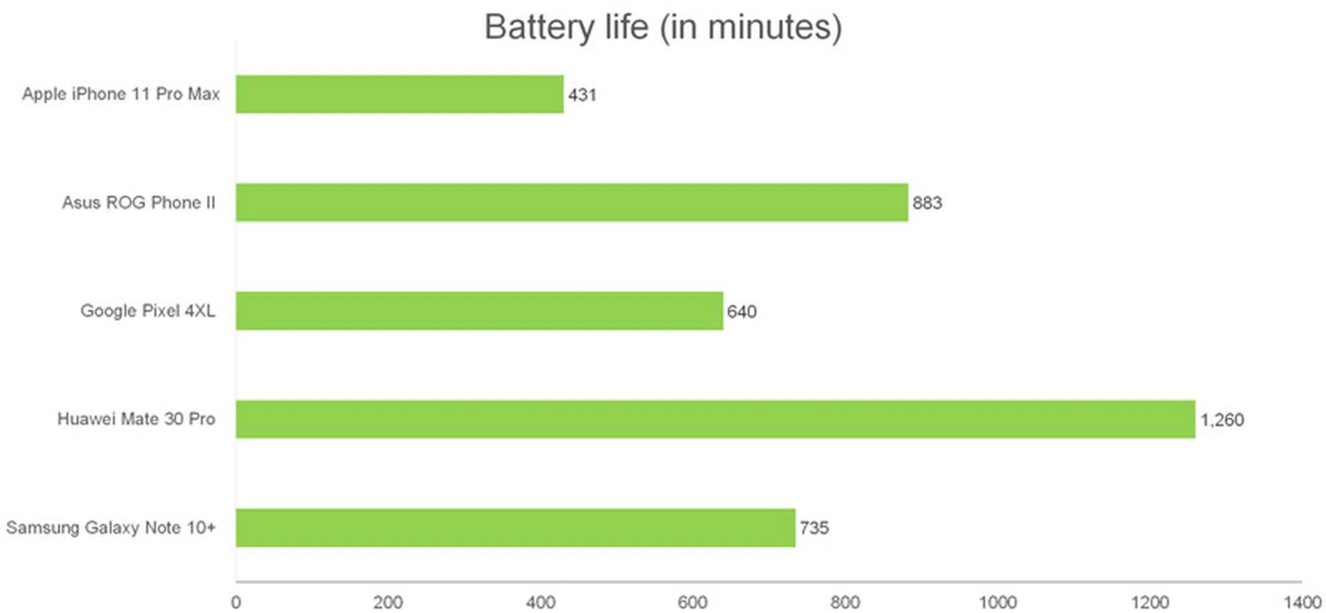 As you can see, the iPhone does quite poorly on this, lagging a good 200 minutes less than the worst Android competitor. Following up from what we were saying earlier, the phone with best battery life actually turned out to be the Mate 30 Pro as that clocked an impressive 1,260 minutes, which is about 21 hours!