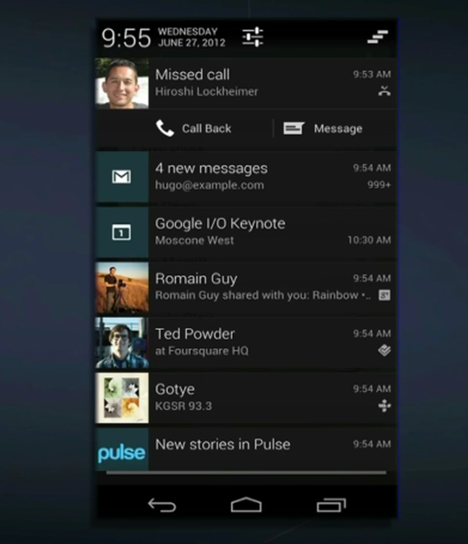 Android users have always cited notification experience as a strong advantage the mobile OS has over the competition. Jelly Bean looks to go an extra step by adding a couple of touches that will make it easier for users to get to where they want, and what they want to do in fewer steps. The notifications tray will spot a new look with more information and features; take for example, you will be able to call back or message straight from the notifications tray when there's a missed call.