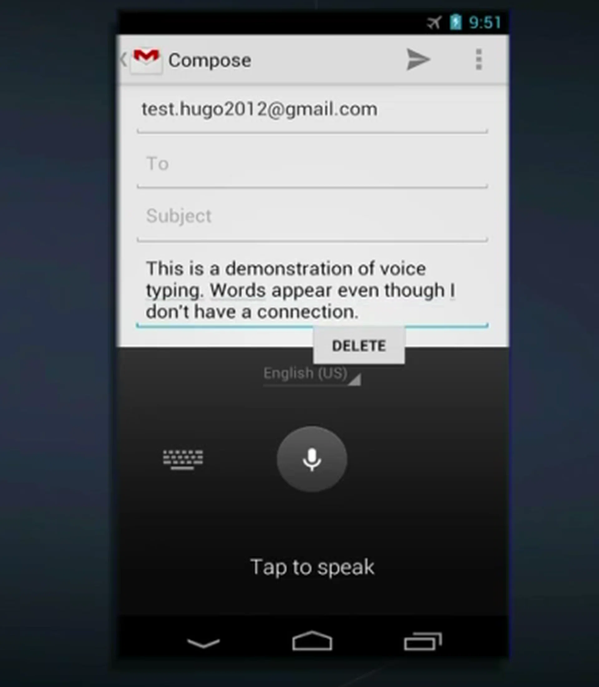 A refined dictionary and an improved predictive keyboard will speed up typing, and there's expanded language support, including Persian, Hindi, and Thai. There's also support for Braille. But that's not all. Jelly Bean will feature a new offline voice typing feature - you can type with your voice even without a working connection - and this will be launching with US English first with more languages to follow later.