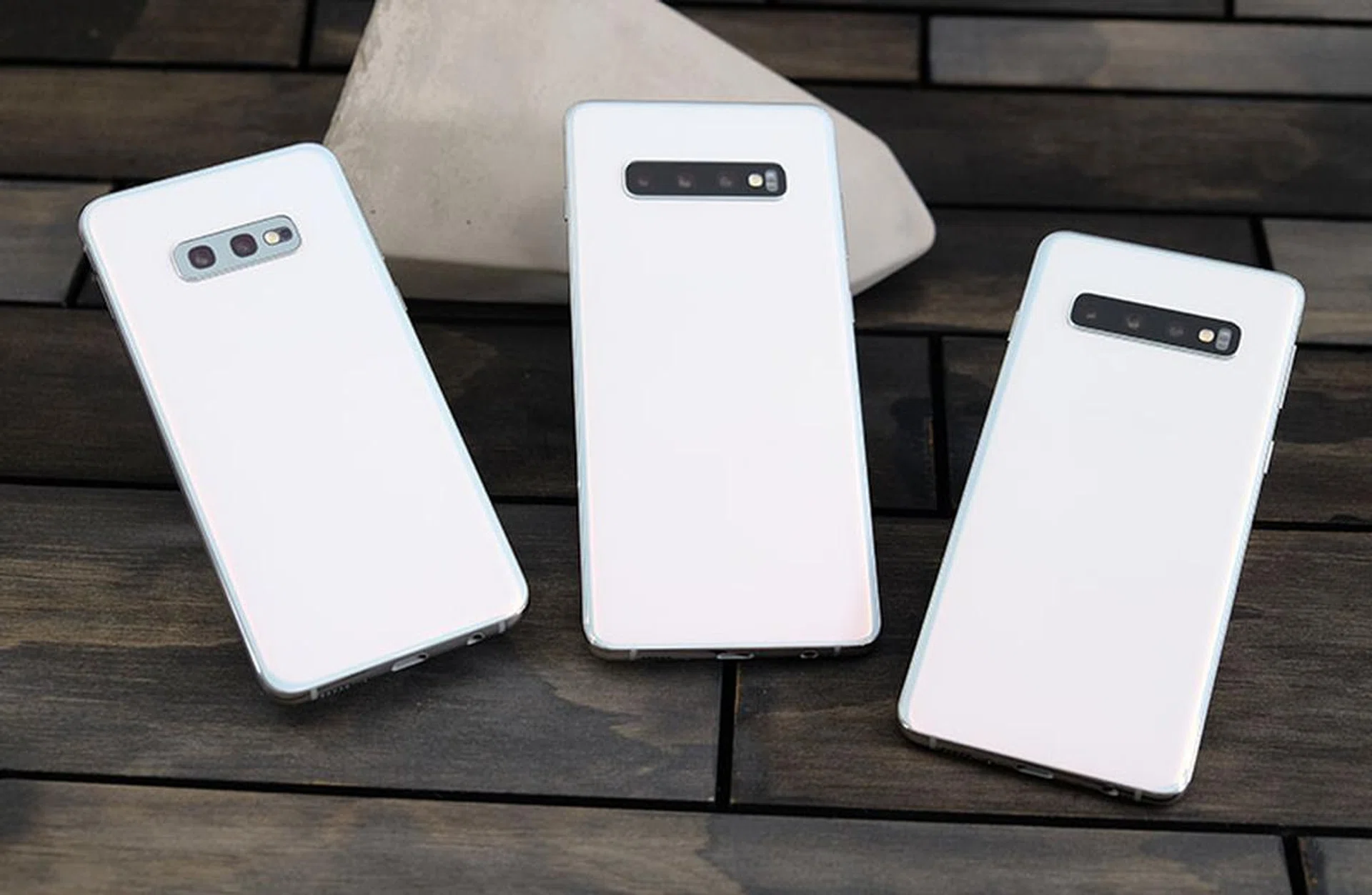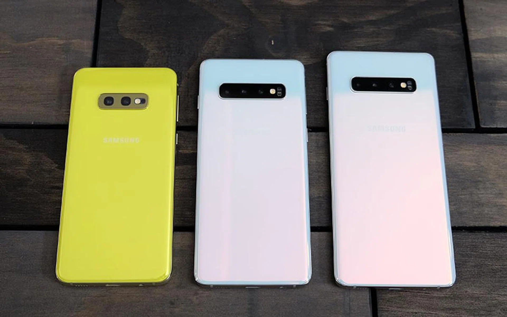 From left to right: Galaxy S10e, Galaxy S10, Galaxy S10+ (S10 5G not pictured).