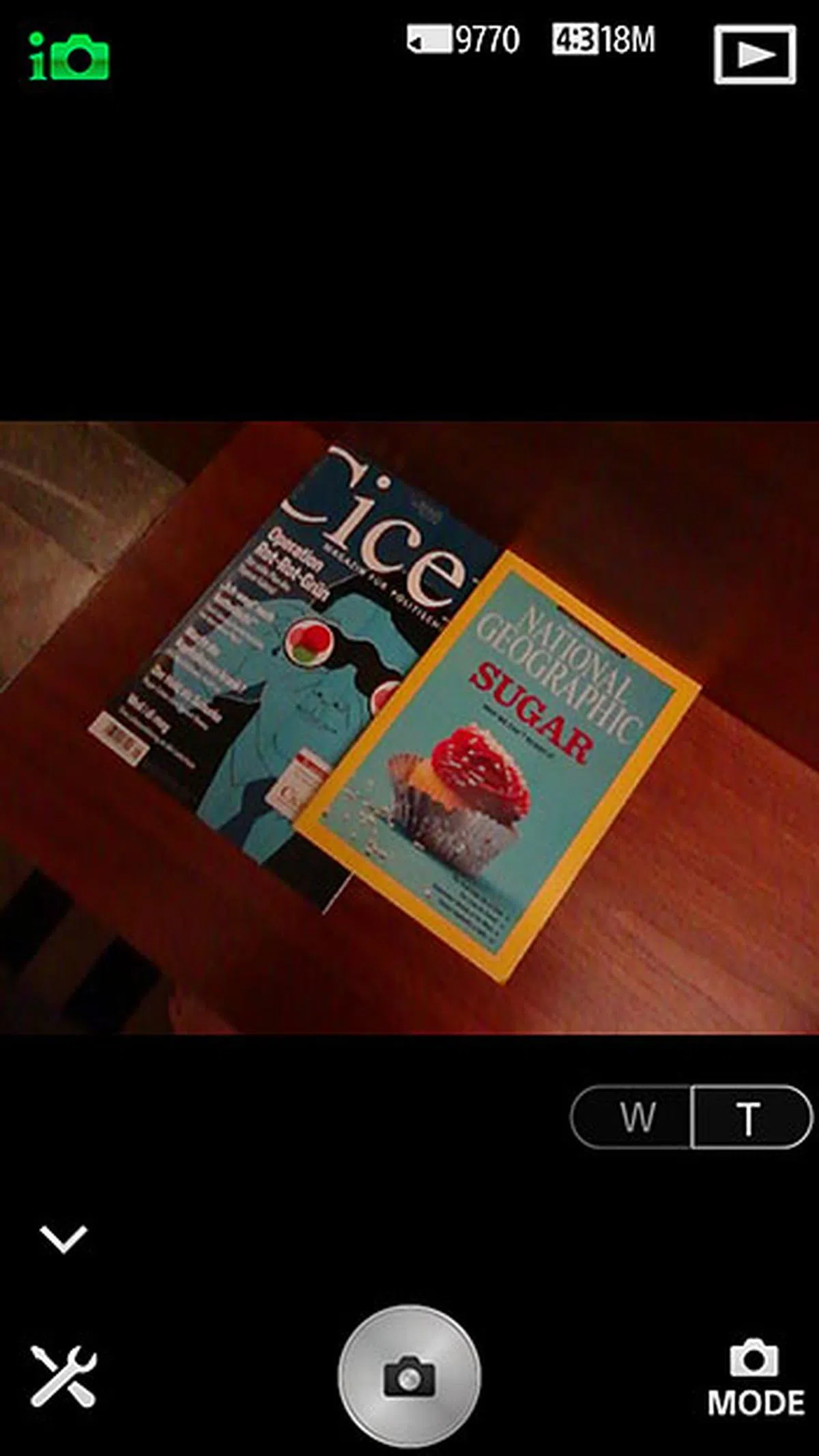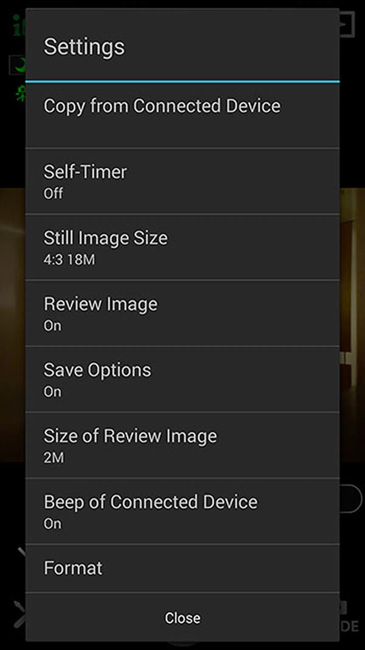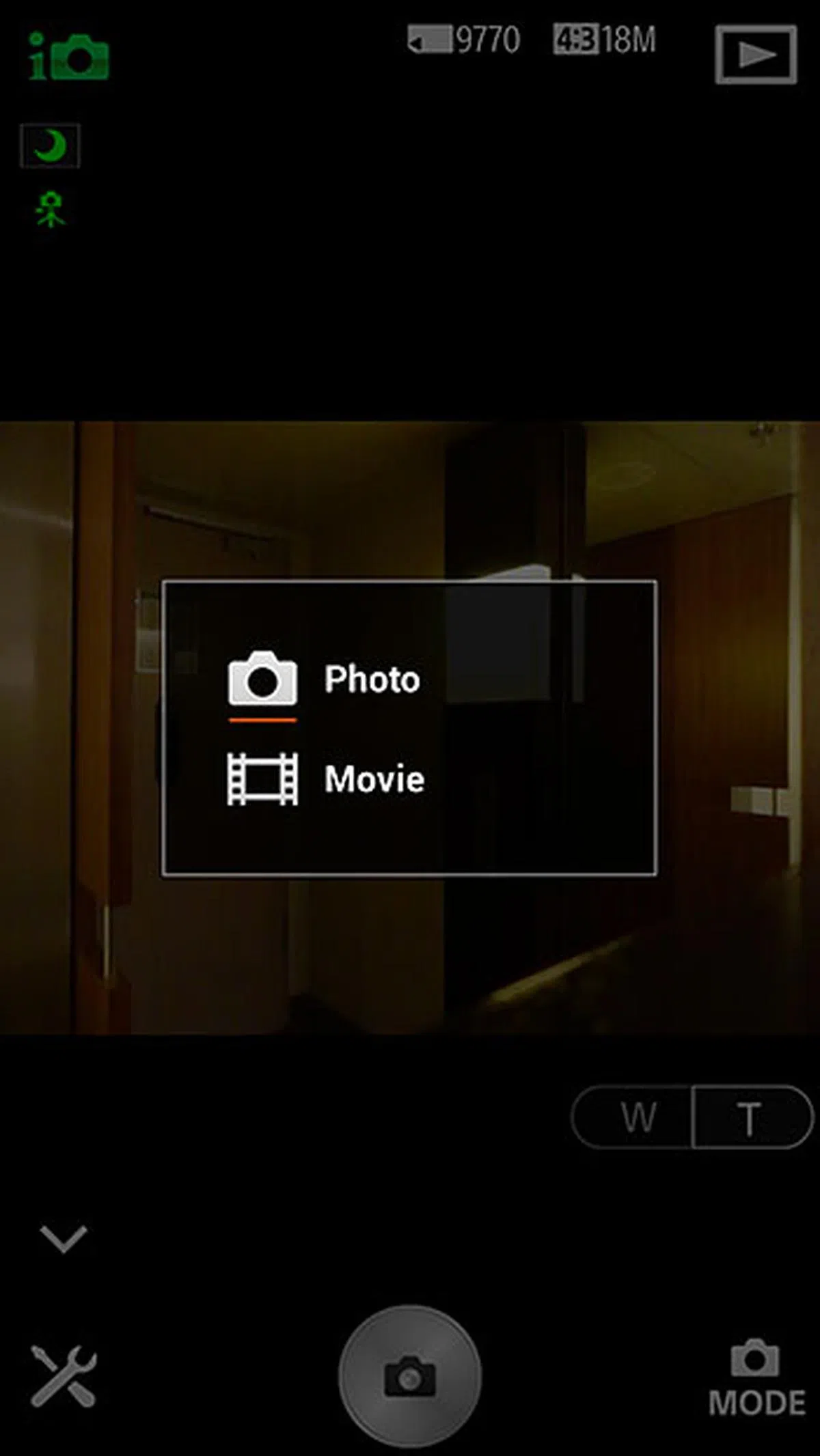 Hitting the play button on the top right opens the Gallery app to view your photos; hitting the mode button on the bottom right allows you to select movie shooting mode. The icon on the bottom left is the settings button. You can turn on self timer (2 or 10 seconds), change image resolution (the lowest is 5MP for a 4:3 image, or 2MP for a 16:9 image), change the size of review image, format the memory card, copy photos over from the connected device, and more. By default, the original 18MP photos are saved in the memory card on the camera, only 2MP photos are transmitted for image review. You can choose whether or not to save these review images. For movies, they’re recorded on the card, but aren’t transferred automatically to the phone.