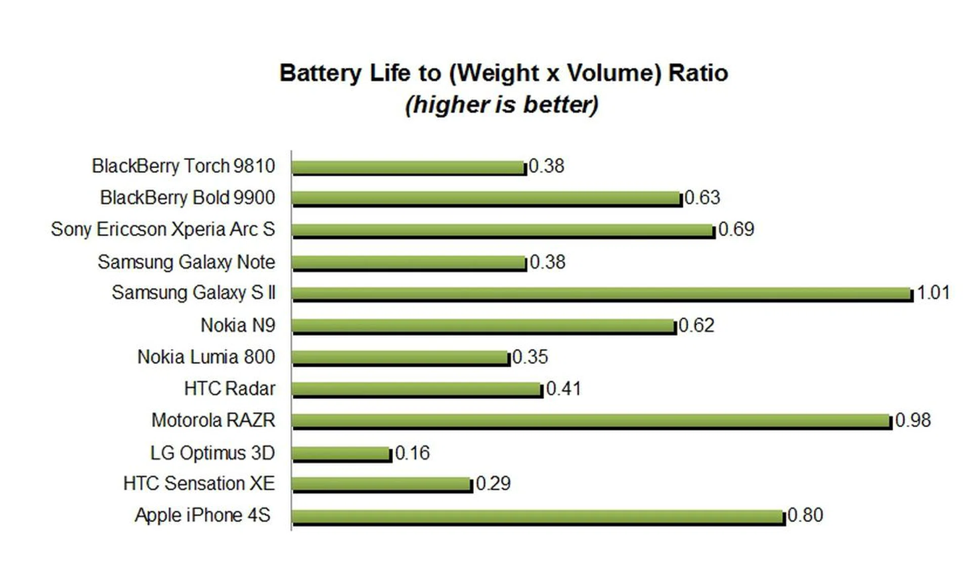 The numbers obtained from our battery tests can be translated to the portability of the smartphone. This is achieved by calculating the ratio of the battery life to the (weight x volume) of the smartphone.