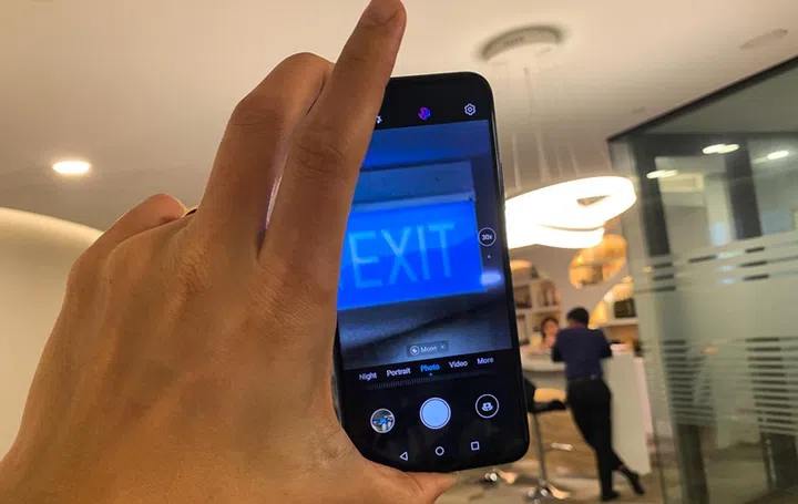 Notice that little pink/purple AI logo? That's the AI camera feature at work, which does scene recognition (in this picture it thinks the EXIT sign is the moon) and automatically applies the appropriate settings for the best image.