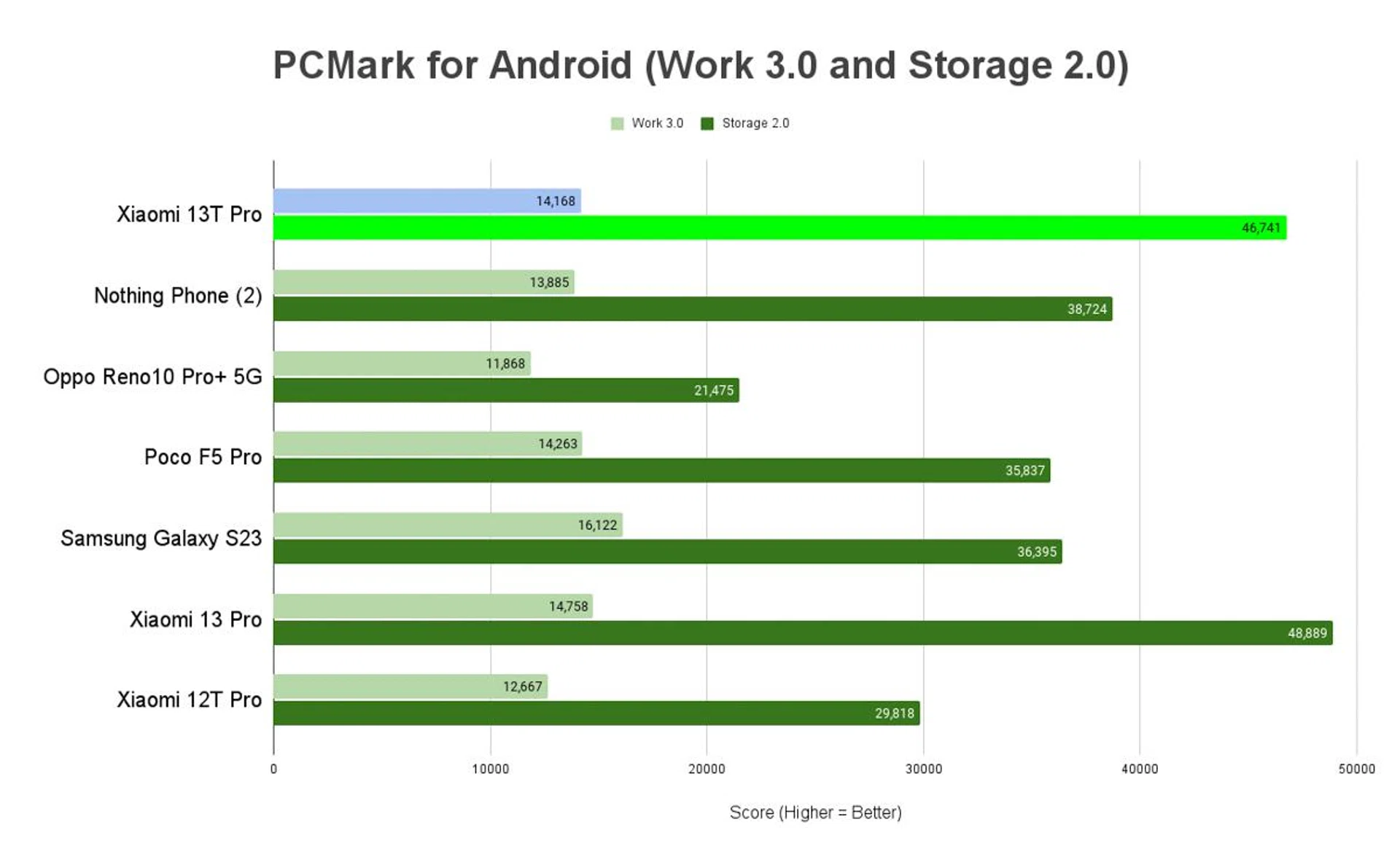PCMark for Android is a benchmark for testing the performance of Android phones and tablets. The Work 3.0 test checks how the device handles common productivity tasks such as browsing the web, editing videos, working with documents and data, and editing photos. Storage 2.0 checks write-in and read-out performance for internal storage, external storage (if applicable), and SQLite database management. Together, the benchmarks can clue us in on how capable a phone is at handling everyday use. Work 3.0 scores are above, while Storage 2.0 scores are immediately below for each device - the higher the score, the better.