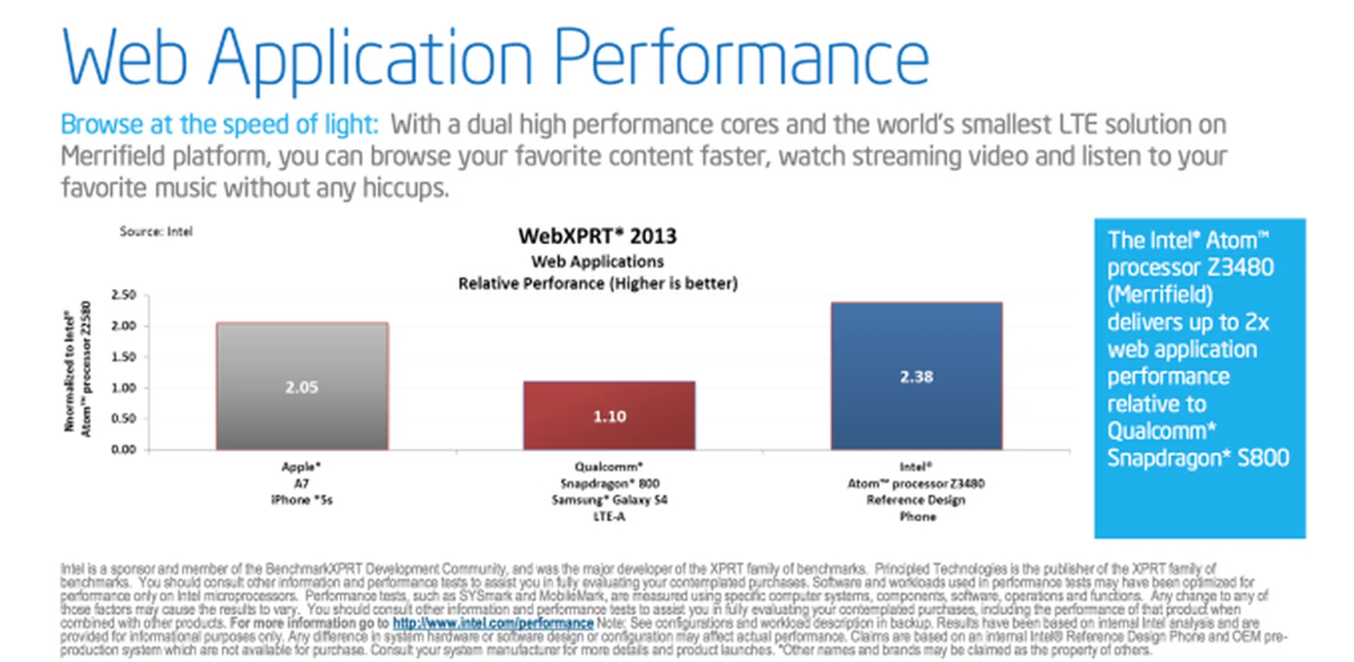 Intel ran through a few benchmarks to showcase the new processors. At WebXPRT2013, a web browsing benchmark, Merrifield outperformed both the Qualcomm Snapdragon 800 and Apple's iPhone 5S A7.