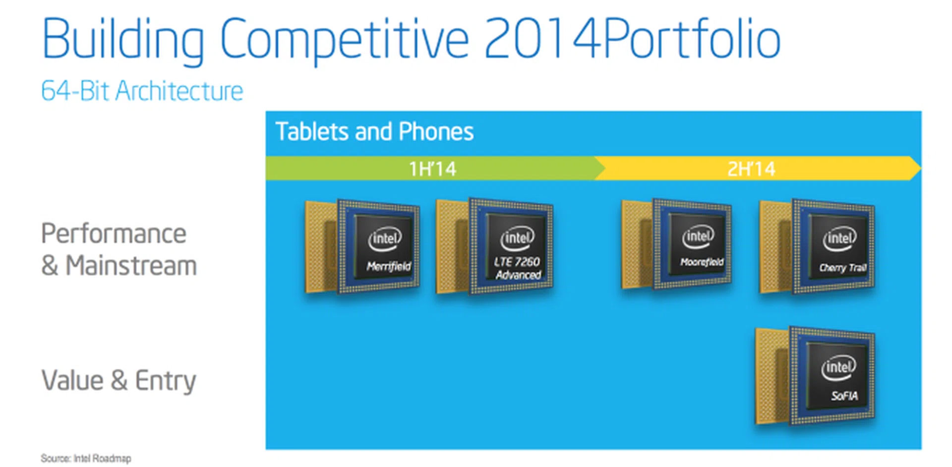 And finally, here's a look at Intel's mobile roadmap for 2014. Cherry Trail will be the 14nm update to Bay Trail, while SoFIA is the entry-level SoC Intel acquired via Infineon - originally a low-end ARM CPU, Intel has apparently altered it to run on Silvermont.