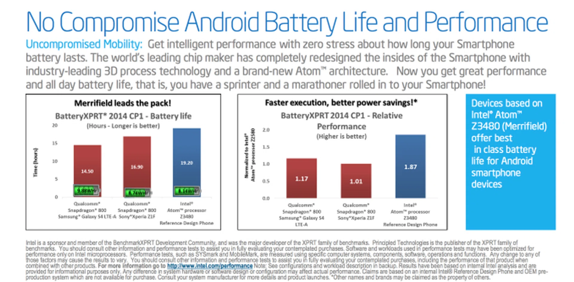 Intel also showed off Merrifield's low power consumption, with its reference Android phone apparently lasting over 19 hours on the Battery XPRT2014 benchmark.