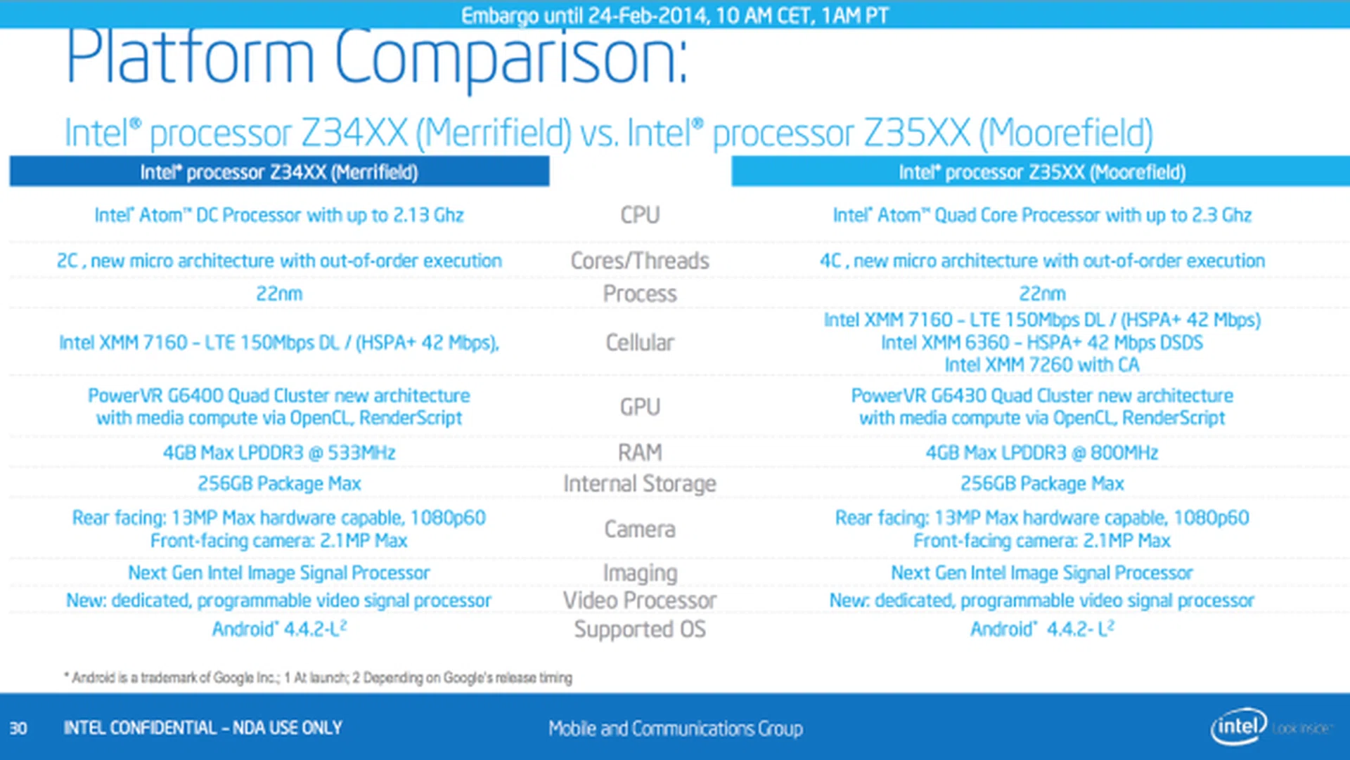 The second processor is codenamed Moorefield and is aimed at devices expected in the latter half of the year. Moorefield is a quad-core processor clocked at up to 2.3GHz, which will also include graphics and display enhancements.