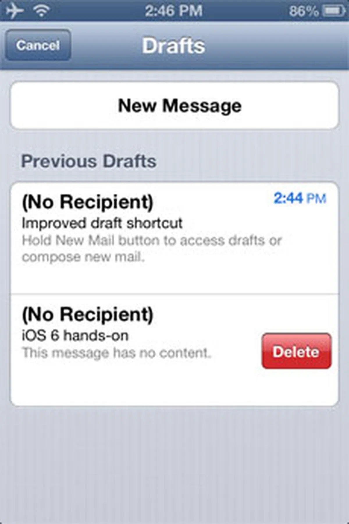 Now, here's a gem we discovered. Before iOS 6, to get to your last email draft quickly, you can tap and hold the Compose button. In iOS 6, this same action will now bring up a Drafts page, where you'll be presented with all your previous drafts, as well as the option to compose a new email message.