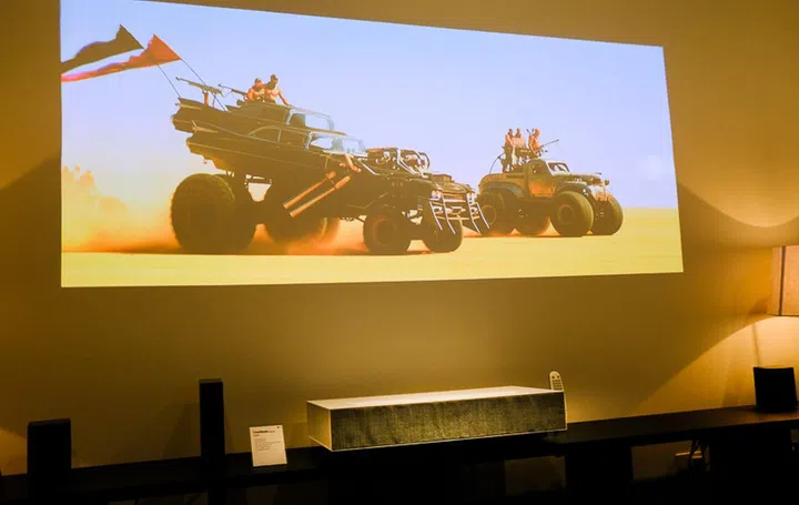 Also on display, was the HU85LA, a short throw 4K UHD Laser Smart Home Theater CineBeam Projector. That's a mouthful, but basically it's capable of giving you a 100" 4K (3840x2160) display from just 3.9" away. It supports HDR and there's even a magic remote controlled so you can use it like a Smart TV.