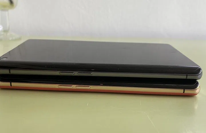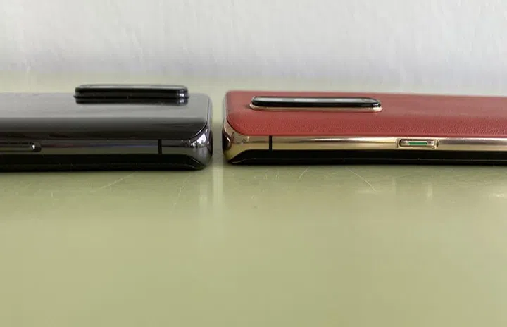 The camera module is less pronounced on the model on the right thanks to the layer of vegan leather. The camera module packs a Sony powered 48MP wide-angle lens, a 48MP ultra-wide-angle lens, and a 13MP telephoto lens, whilst supporting 10x Hybrid Zoom.