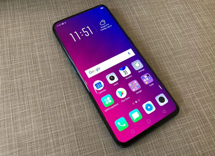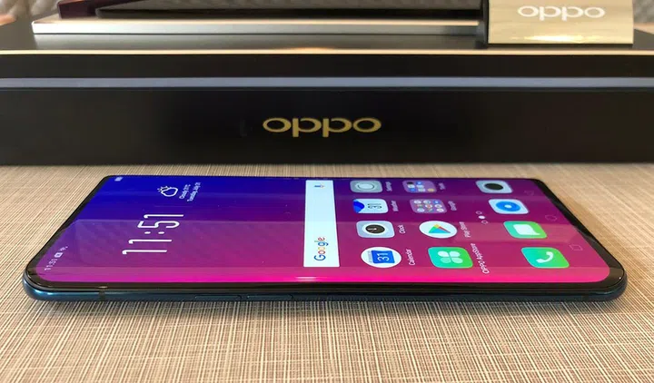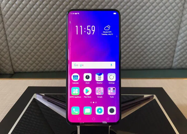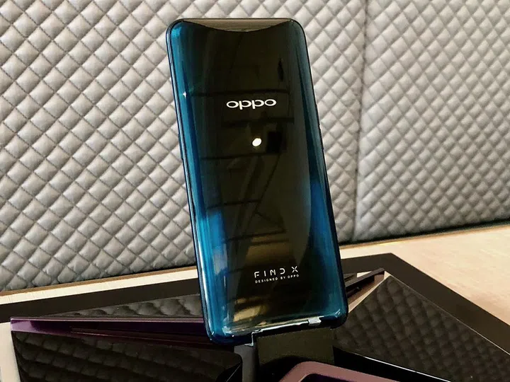 At 93.8%, the Oppo Find X has the biggest screen-to-body ratio of any smartphone. The screen is a 6.42-inch AMOLED Full HD+ display with a 19.5:9 aspect ratio. The camera module is hidden inside a sliding module that pops out of the top of the phone.
